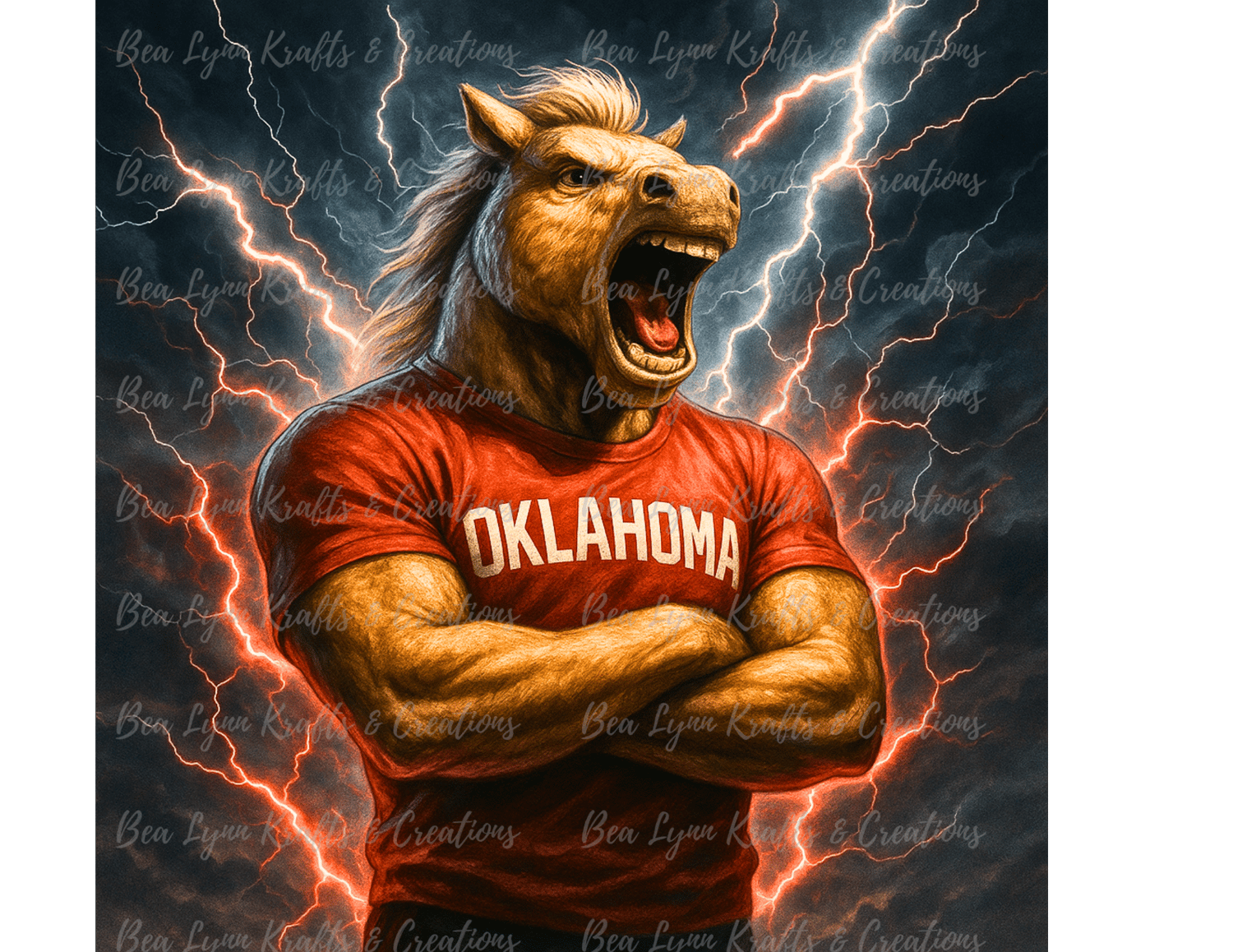 Bring the storm and shake the stands with this electrifying Oklahoma Sooners mascot PNG! This high-impact digital artwork showcases a thunderous, roaring horse mascot, arms crossed, muscles flexed, and lightning tearing through a stormy sky behind him. Wearing a bold crimson "OKLAHOMA" shirt, this design delivers pure game day fury and unmatched energy.