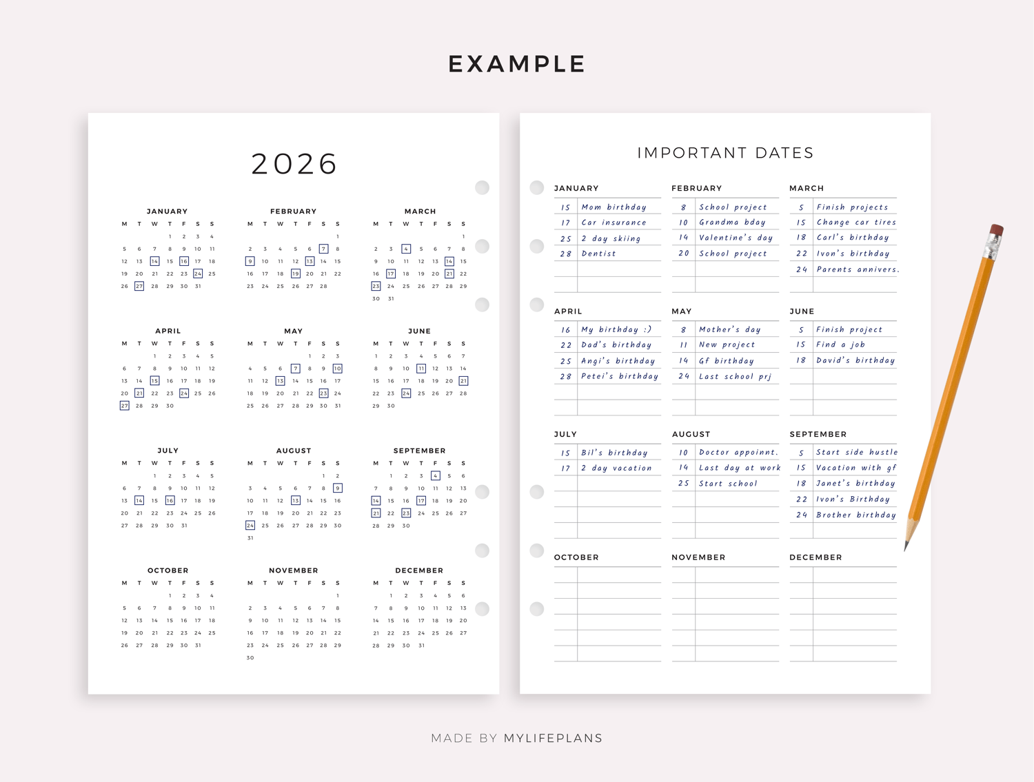2026 Calendar and Important Dates Page Printable - Birthdays, Anniversaries, Travels, Doctor Appointments, Car Maintenance, ect, A4/Letter