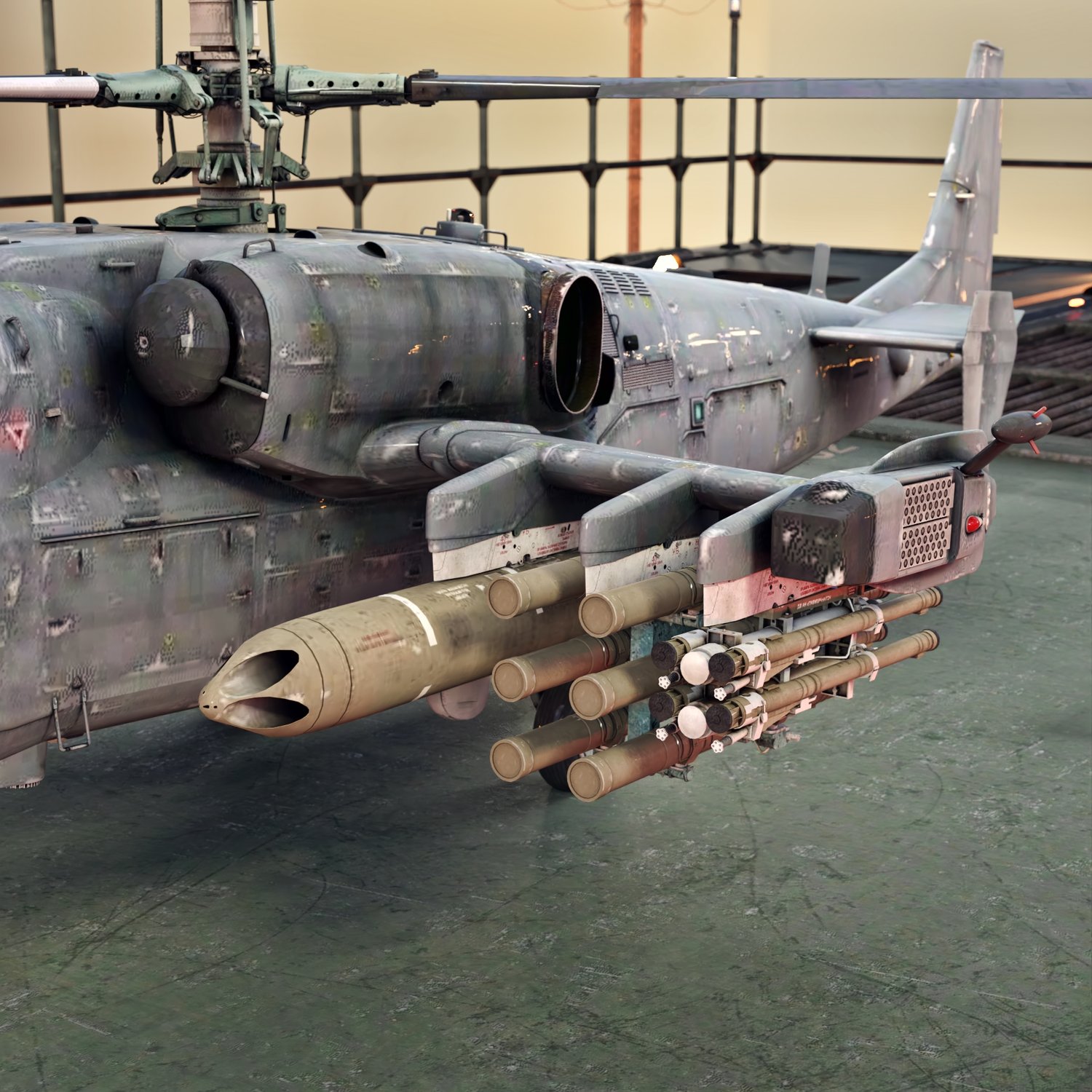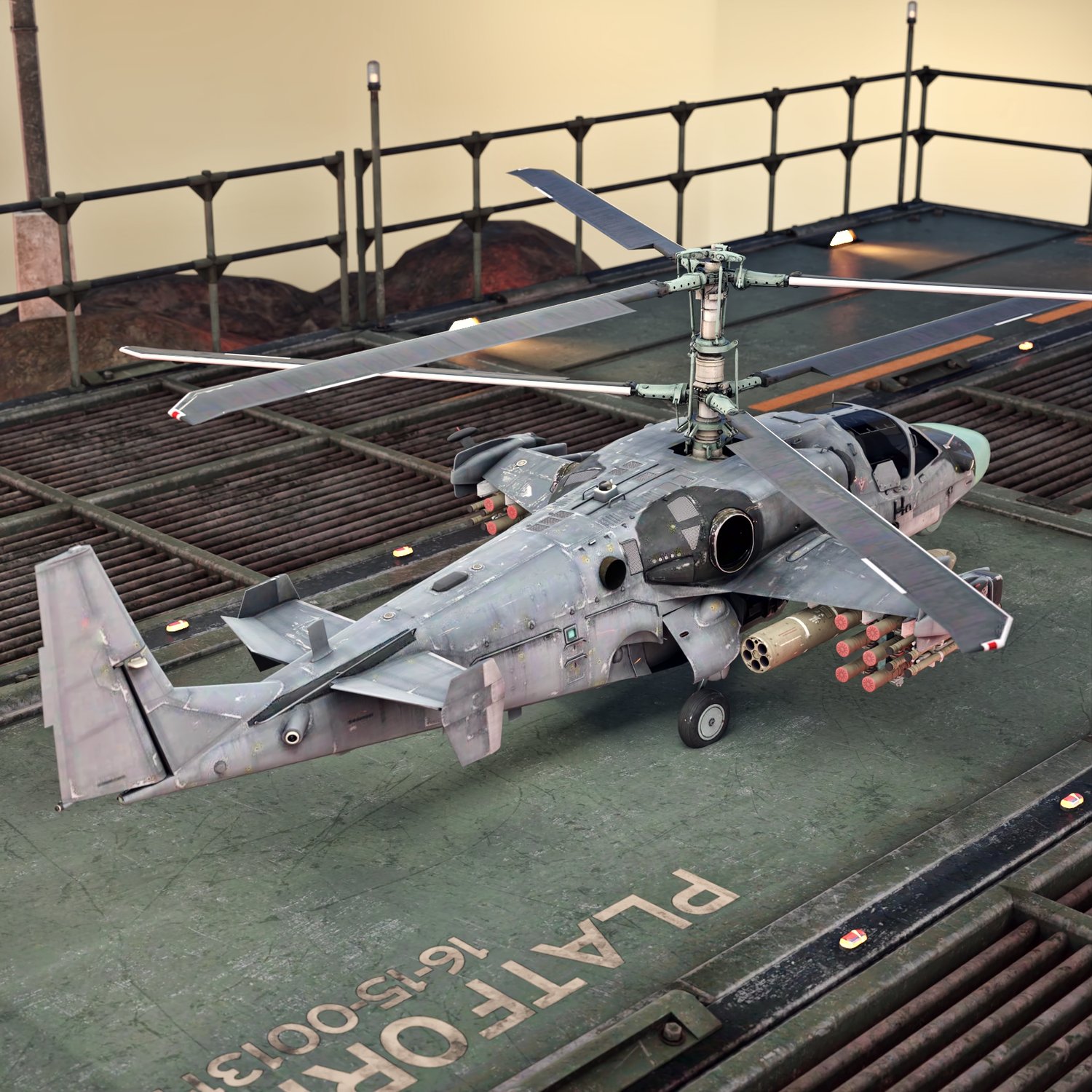 A famous attack helicopter in the KA 50 line, for your special operations, infantry support and anti-armor missions. It's a tandem side by side configuration, so you can take a friend with you. Very useful, mobile and serious flying vehicle. Converted and rigged for use in DAZ. Includes 3 kinds of rockets on the wings and a cannon.