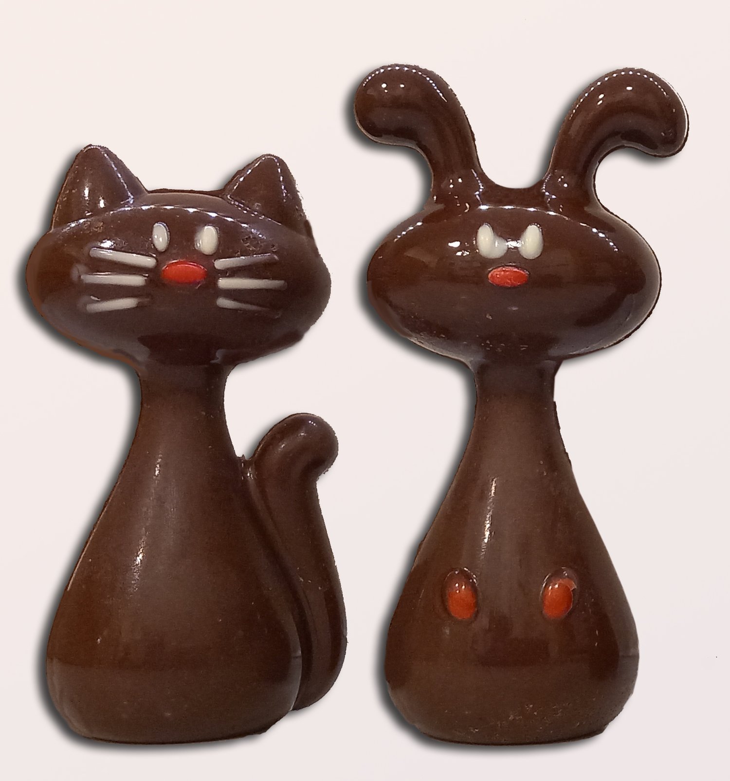 Moulage "Chat de Pâques " 2 pièces décorées à la main. Pur beurre de cacao minimum 38%