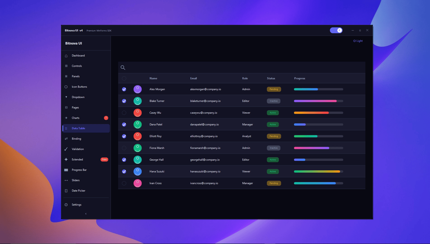Bitnova UI SDK is a premium WinForms component library that gives .NET developers beautifully designed, production-ready controls right out of the box. Whether you're building internal tools, client-facing desktop software, or a SaaS product with a Windows frontend, Bitnova makes it look like it was designed by a professional UI team.