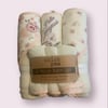 Rose pink floral print. "Hello Gorgeous" embroidered on one towel.