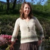 The sweater VÅRKLØVER (SPRING CLOVER) is worked from the bottom up in the round, then divided for armholes and neck before working the separate parts flat to the shoulders. The front neckband is worked as you go, leaving the live stitches on holders. The shoulder seams are grafted using the three-needle bind off. The neckband is then continued in the back from one side, and grafted using Kitchener stitch on the other side. Stitches are then picked up around the armholes and sleeves are worked from the top down, starting with short rows to shape the sleeve cap. The edges on this sweater are worked in seed stitch and the Fair Isle band uses eight co-ordinating colours; the chart and colour inspiration were found in “A Shetlander’s Fair Isle Graph Book”. The rest of the sweater is worked in the main colour, with seed stitch diamonds spread over the bottom half of the body and sleeves.