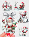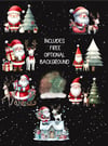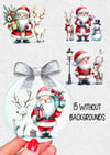 20 whimsical Santas with reindeer. 20 different PNG files, 5 with background, 15 without (separate optional background supplied). Digital. Please see pictures for included designs. 21 PNG files. Instant download for sublimation and print. Ideal for greetings cards, Christmas ornaments, clothing, cushions, prints.