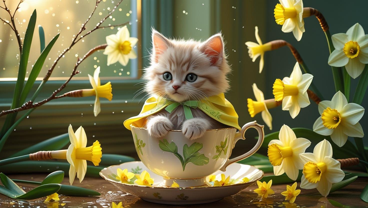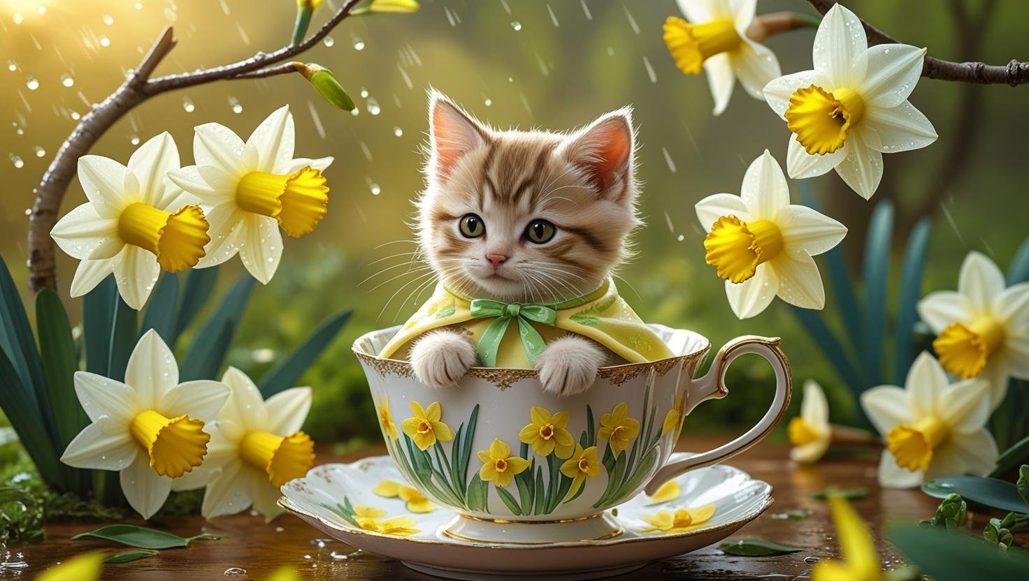 This cozy printable art set features an adorable kitten wrapped in a soft yellow cloak, nestled inside a daffodil-themed teacup. Surrounded by golden blooms and gentle raindrops, each illustration captures the feeling of early spring — hopeful, sleepy, and just a little bit magical.