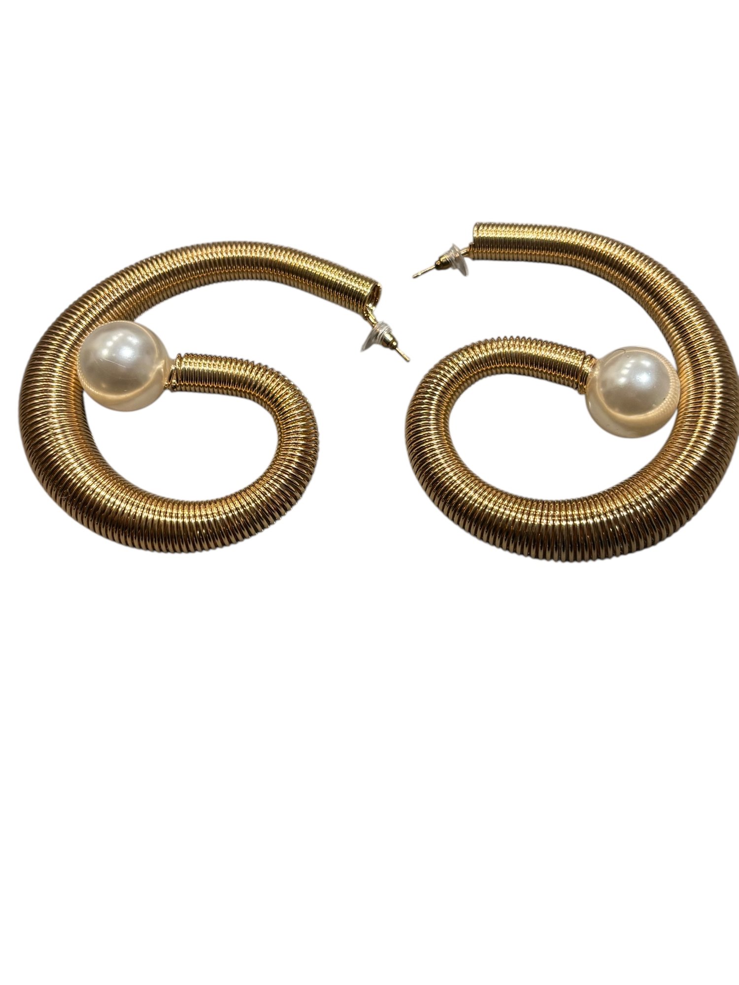 Modern statement hoop earrings featuring a bold coiled gold-tone design finished with faux pearl accents. Chic, lightweight, and eye-catching — perfect for elevating everyday looks or adding drama to an evening outfit. Unsigned costume jewelry.