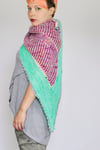 Dieses graphische, leicht asymmetrische Tuch wird in der Diagonale gearbeitet. Das große Dreieck aus Patent- und Kraus-Rechts-Streifen wird von eingerahmt von verkürzten Reihen in kraus rechts. Der verspielte Picot-Kante ist der perfekte Abschluss.