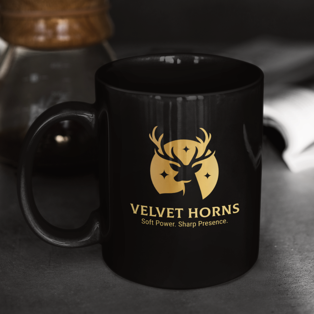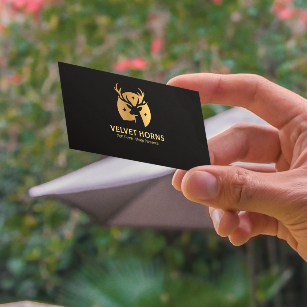 This elegant logo features a stylized golden deer head framed by a celestial circle, evoking grace, strength, and quiet dominance. The minimalist antlers and shimmering star elements symbolize vision, power, and refined leadership. Paired with the bold serif logotype and the tagline “Soft Power. Sharp Presence.”, this design is crafted for premium brands with a poised yet commanding identity.