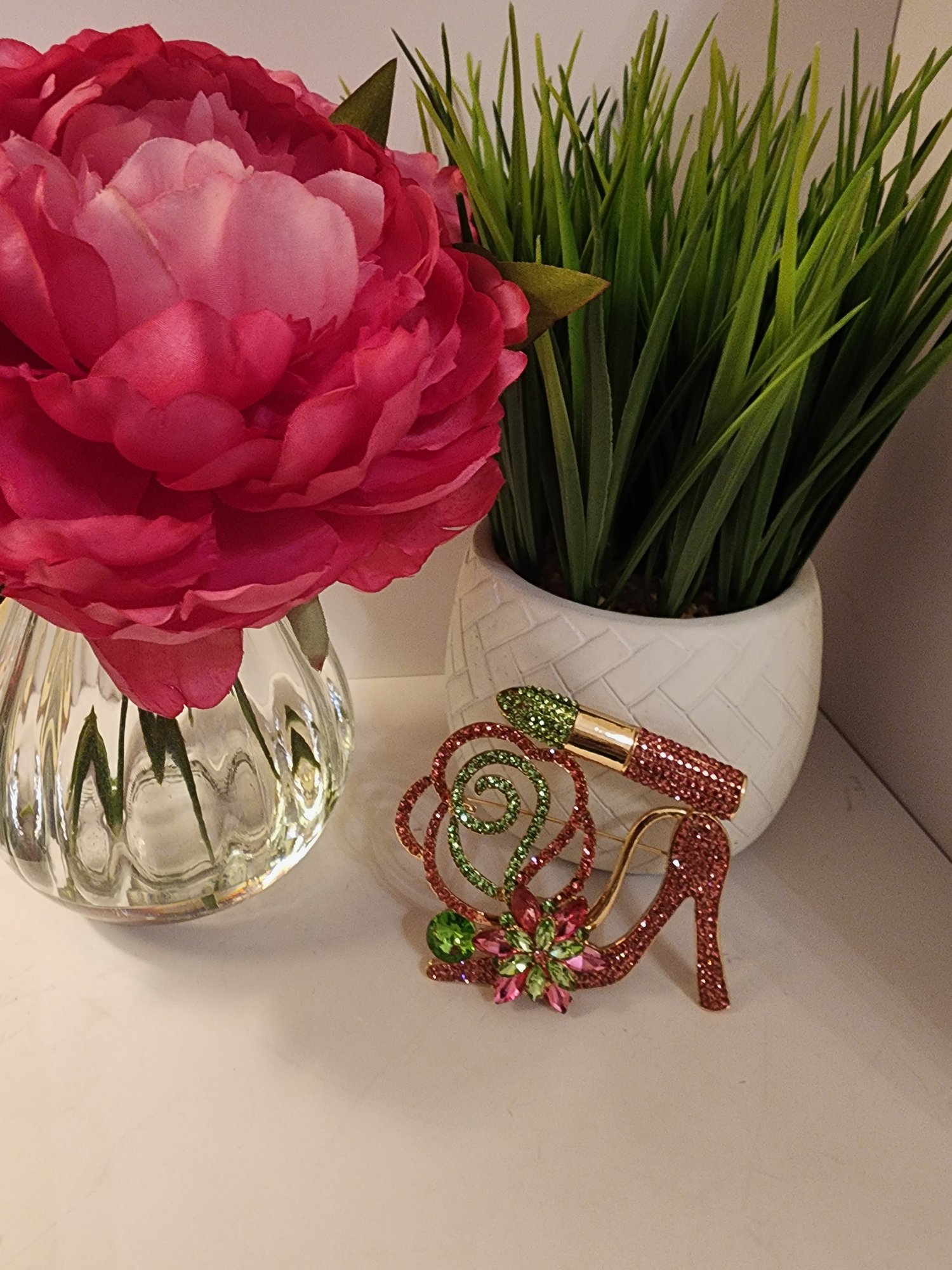 Elegant brooch set featuring a sparkling pink high heel and green accents. Perfect for adding a touch of glamour.