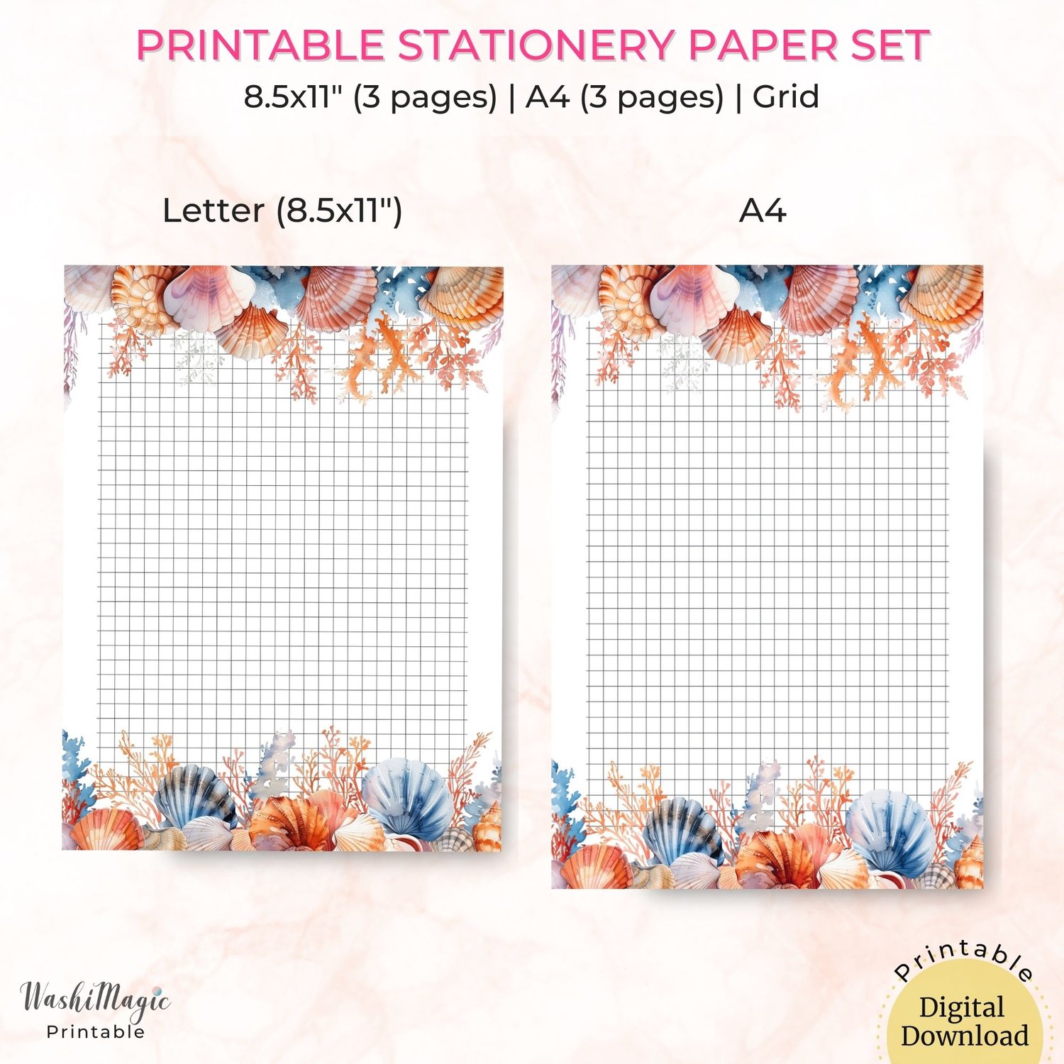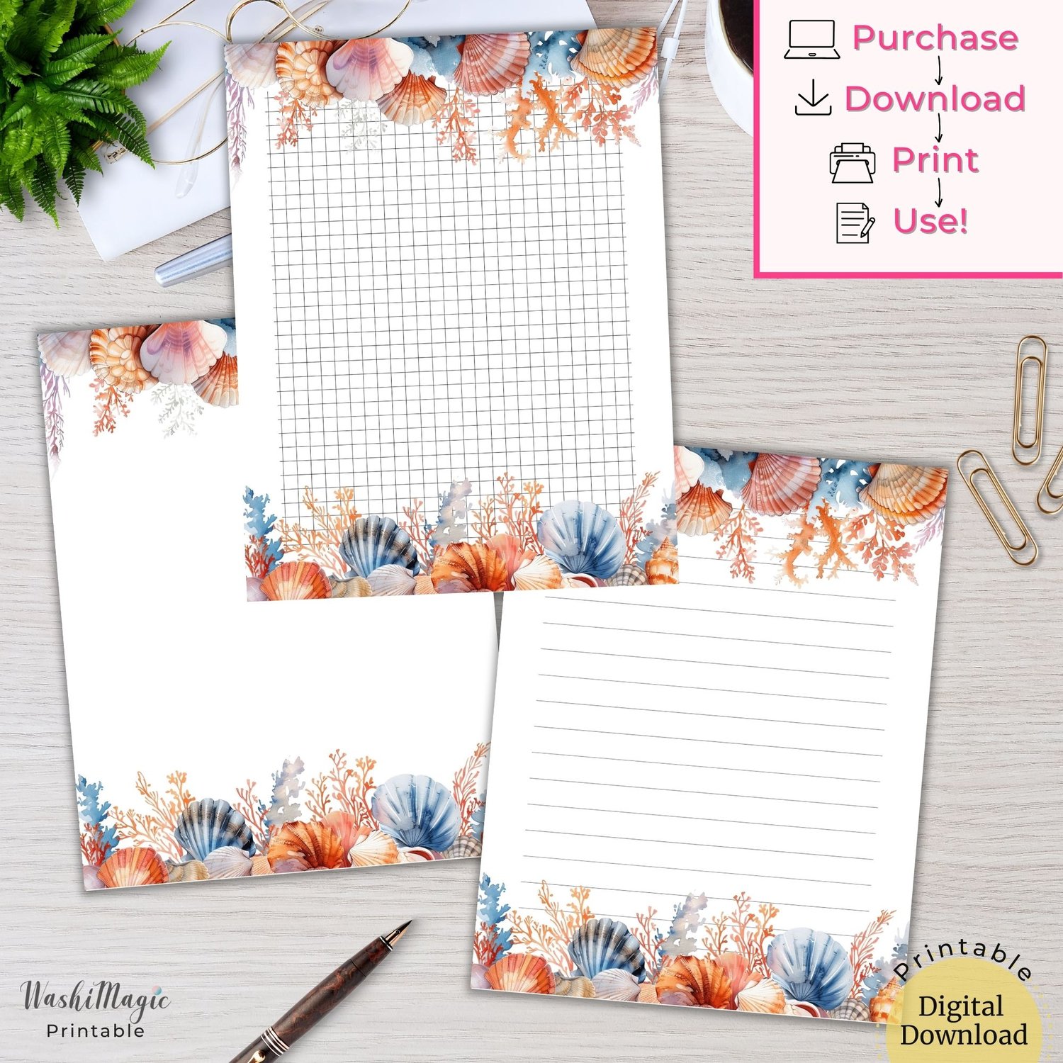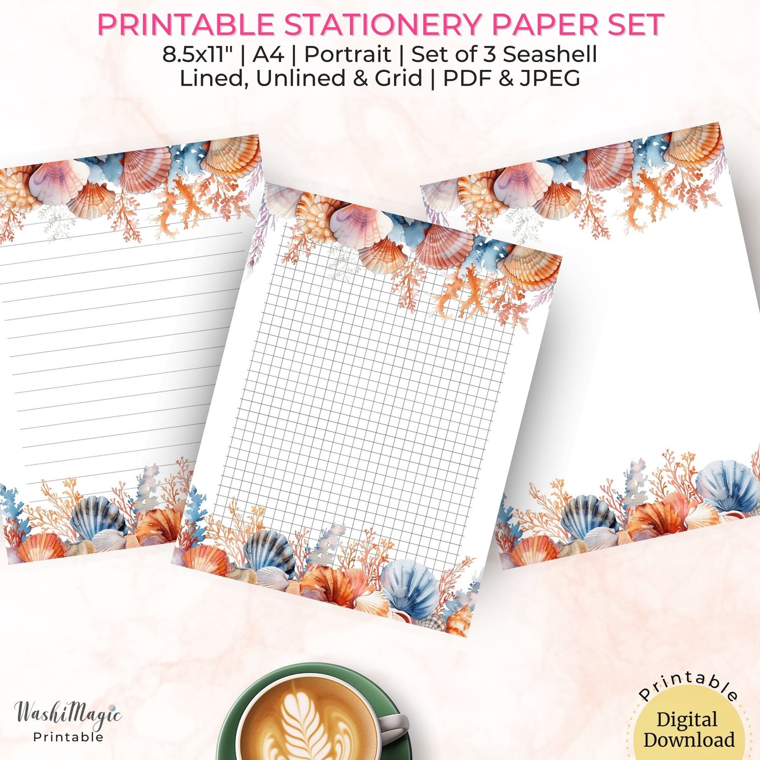 Printable Seashell Stationery Paper Set, Grid Paper, Lined Paper, Unlined Paper