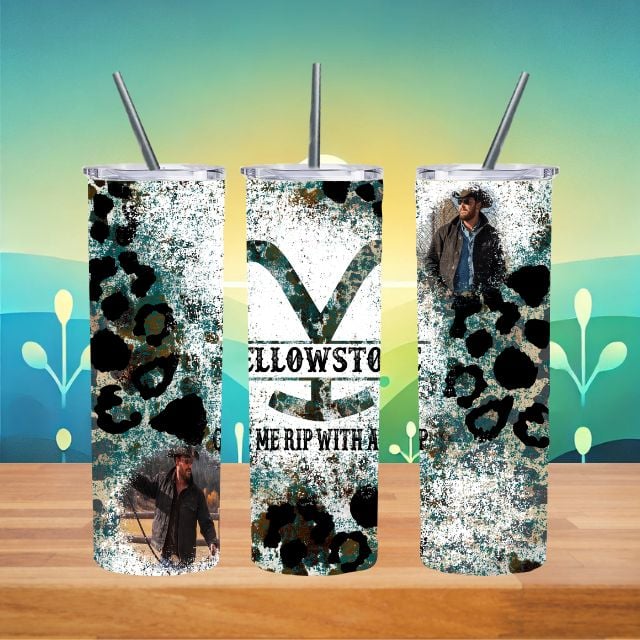 Make a bold statement with this eye-catching sublimation tumbler, featuring a vibrant blue cheetah print and the playful phrase, "Give Me RIP With a Whip," alongside the word Yellowstone. Perfect for fans of the hit series and everyone’s favorite cowboy, RIP, this tumbler is as fierce as it is functional.