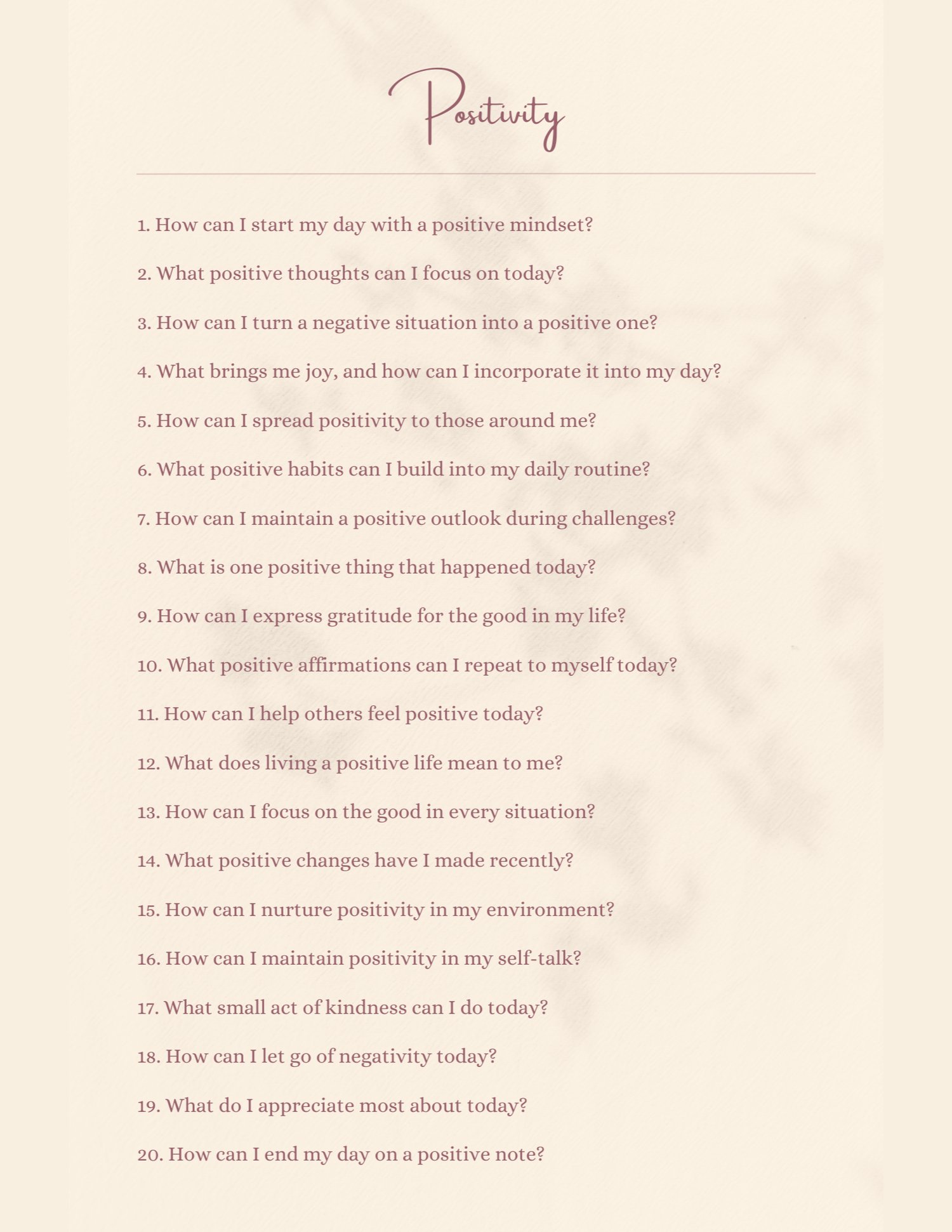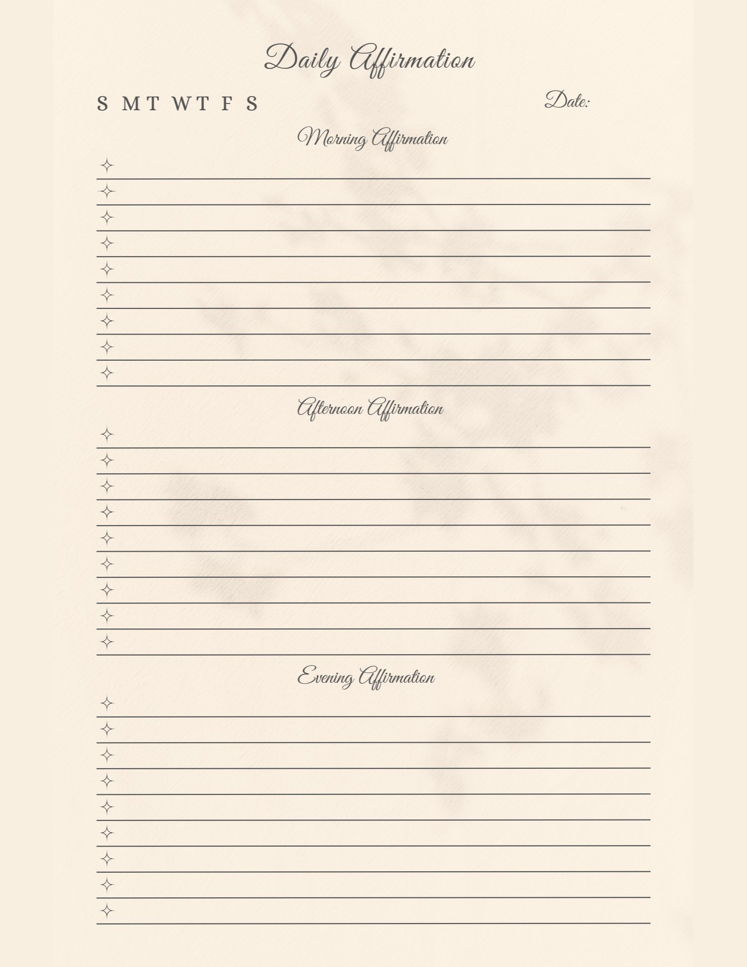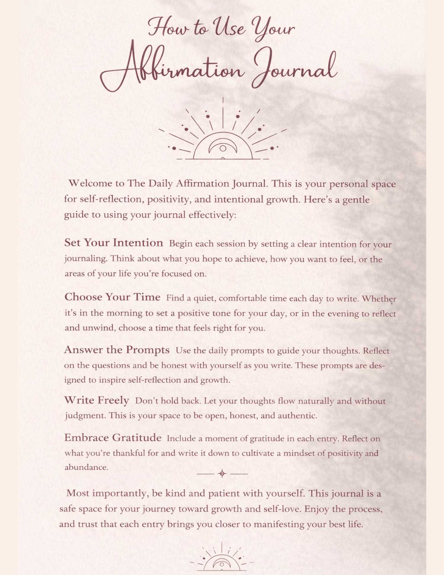 The Daily Affirmation Journal is an 80-page guided journal designed to support your personal growth through intentional writing, self-reflection, and manifestation. Inside, you’ll explore powerful daily focus areas like positivity, gratitude, confidence, relationships, health and wellness, inner peace, spiritual grounding, joy, forgiveness, and emotional growth.