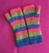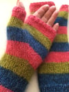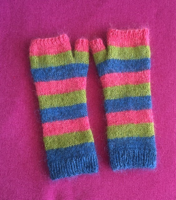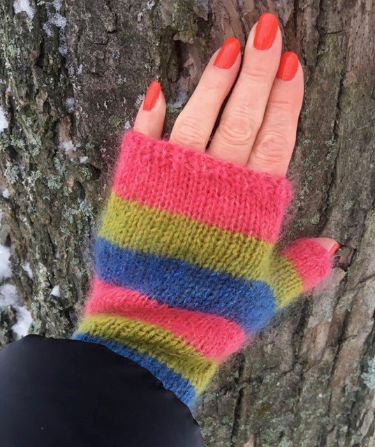 Feliz Mitts are fingerless gloves, knit from the bottom to the top with 2 strands of yarn (merino and silk mohair) held together.