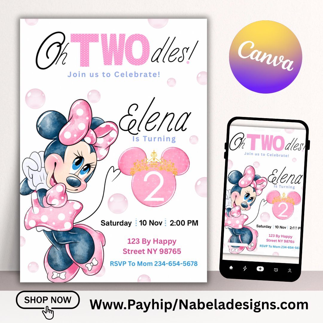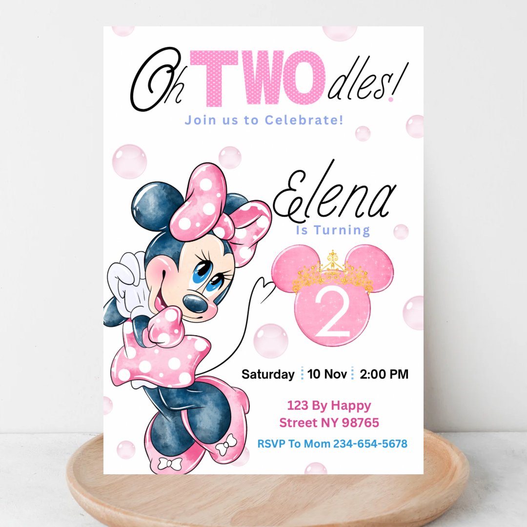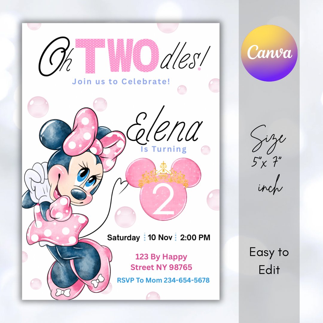 Celebrate your little one’s 2nd birthday with this adorable Minnie Mouse Oh Twodles Birthday Invitation! 🎀✨ Perfect for a Minnie-themed party, this invitation features a fun pink design and is fully editable so you can personalize it with your party details.