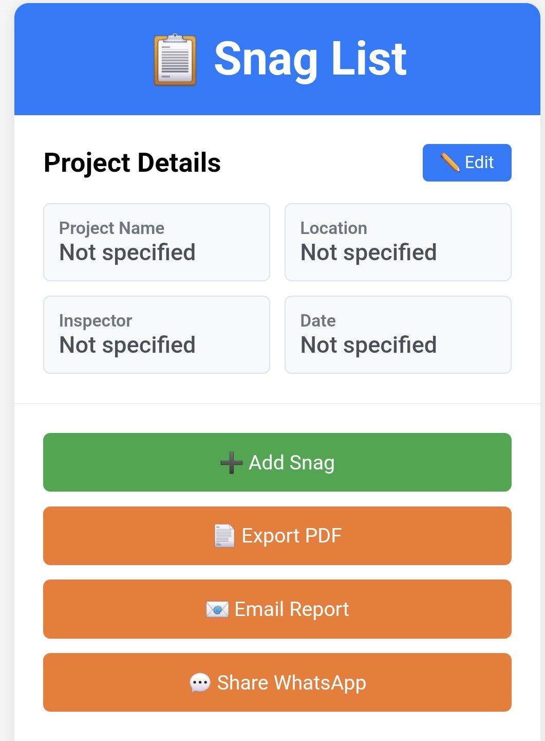 Getting started is intuitive – enter your Project details, Location, and Inspector information. Tap "+Add Snag" to document each issue with comprehensive details and up to 5 high-quality photos per snag. Your thorough documentation ensures nothing gets overlooked.