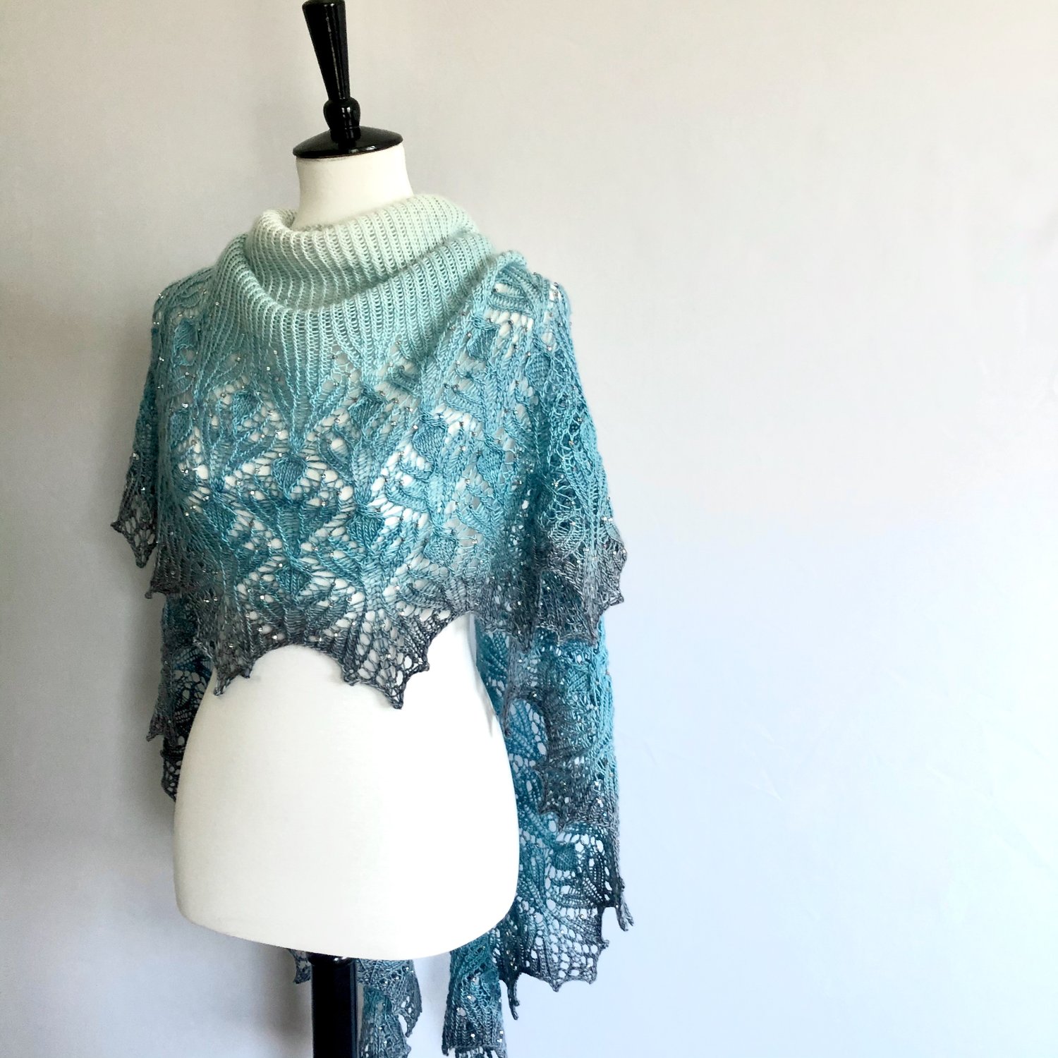 Sample was knit in the large size in the Waterfall gradient colorway with transparent clear color-lined Steel beads.