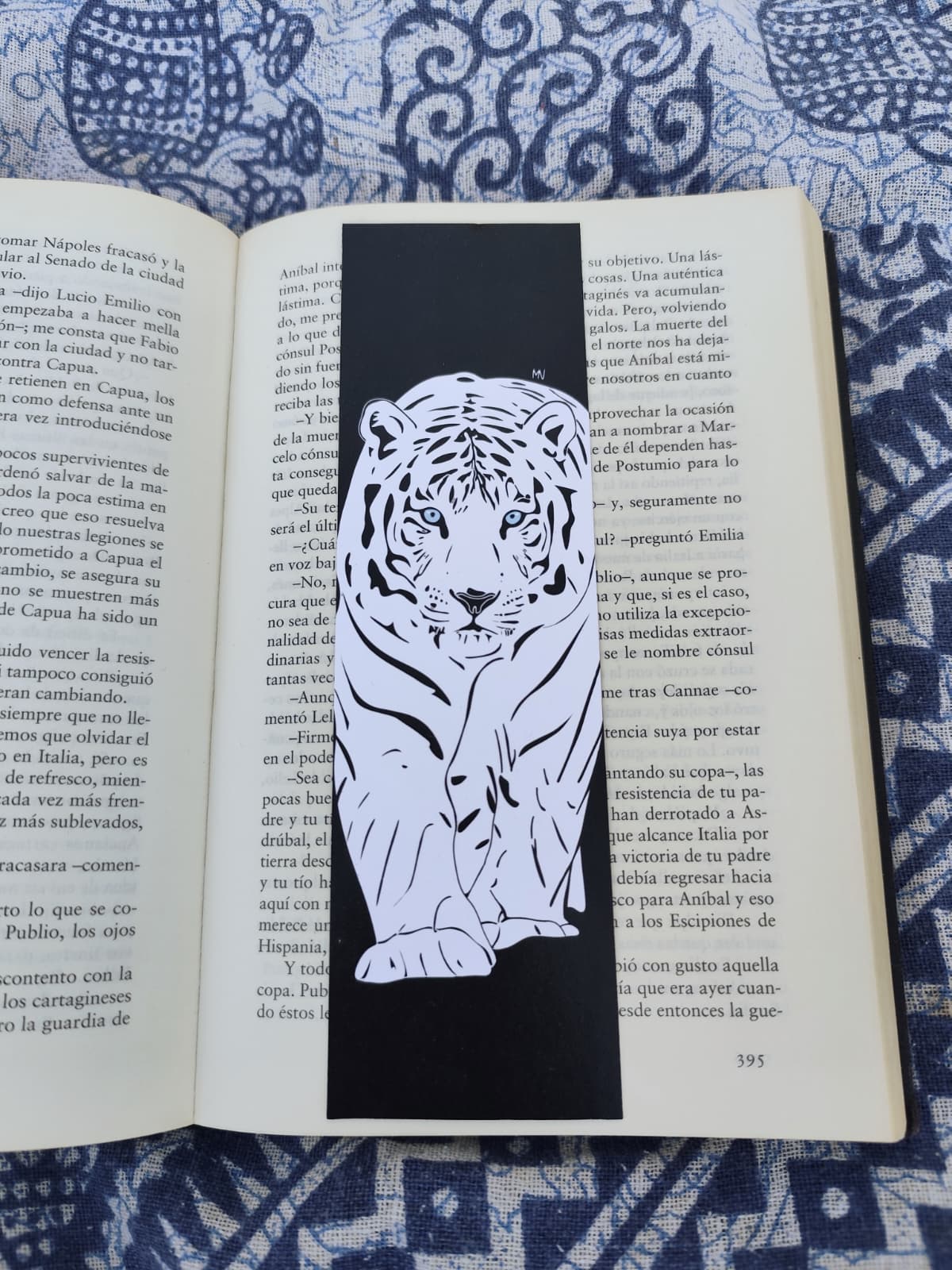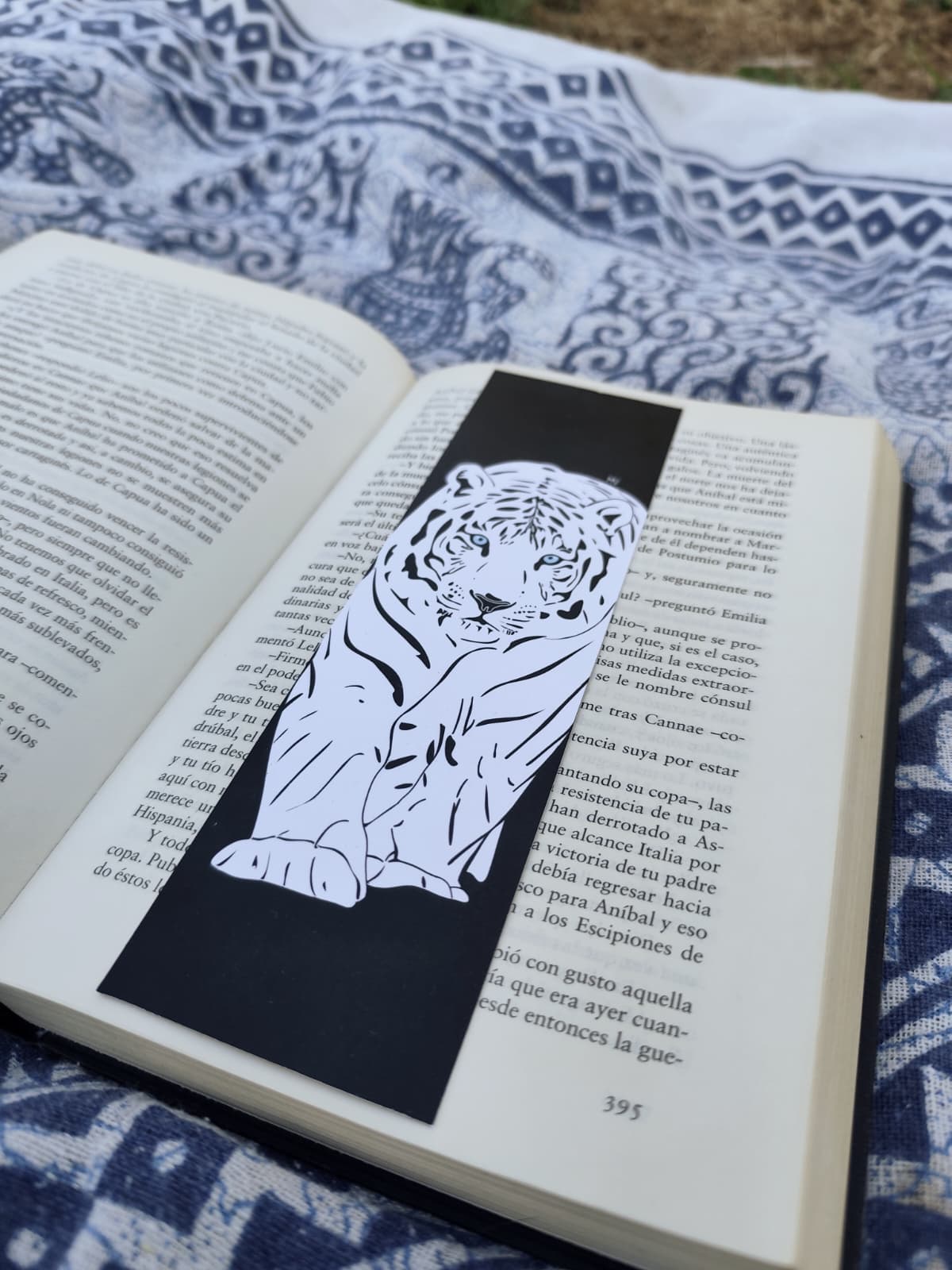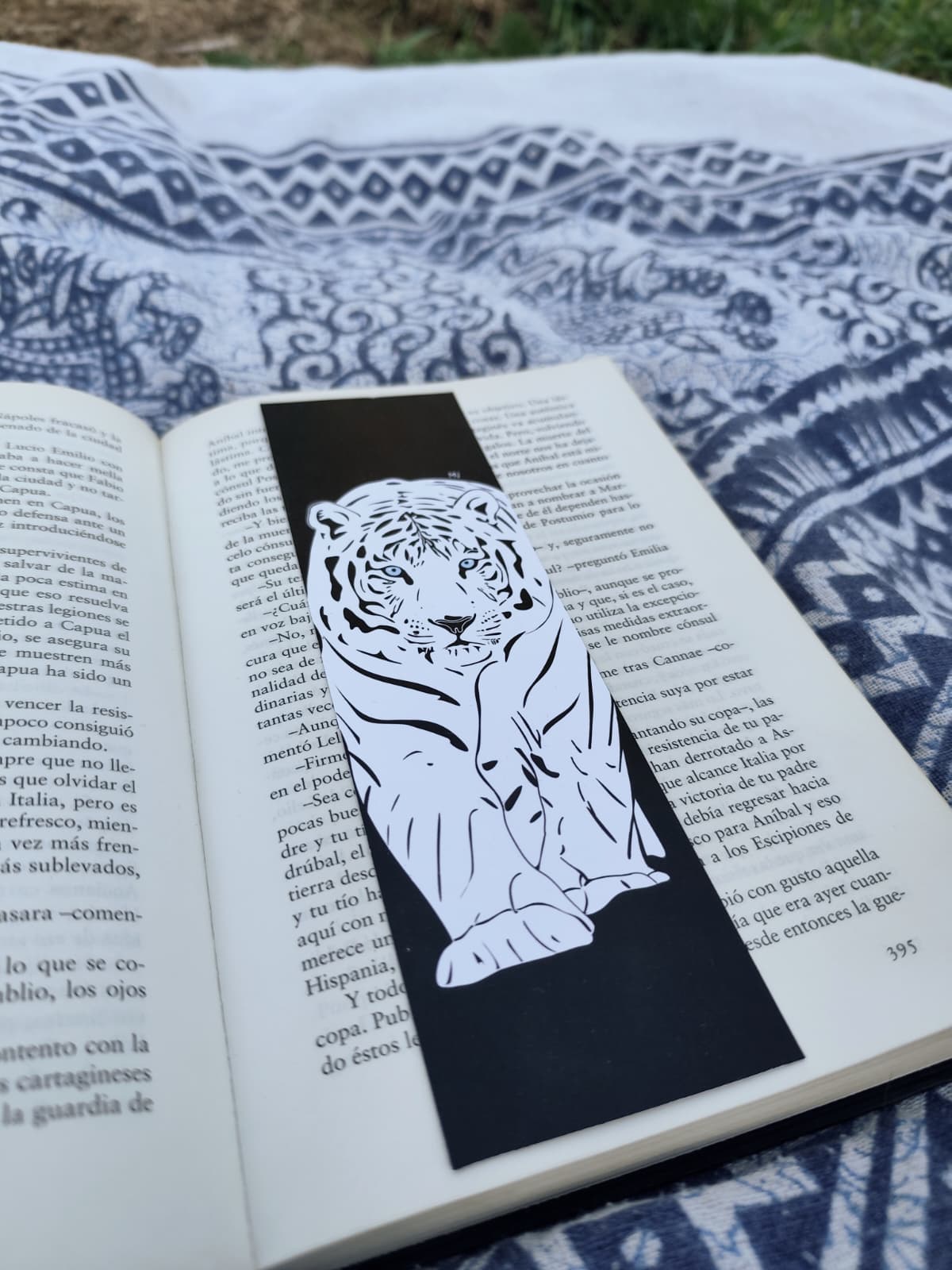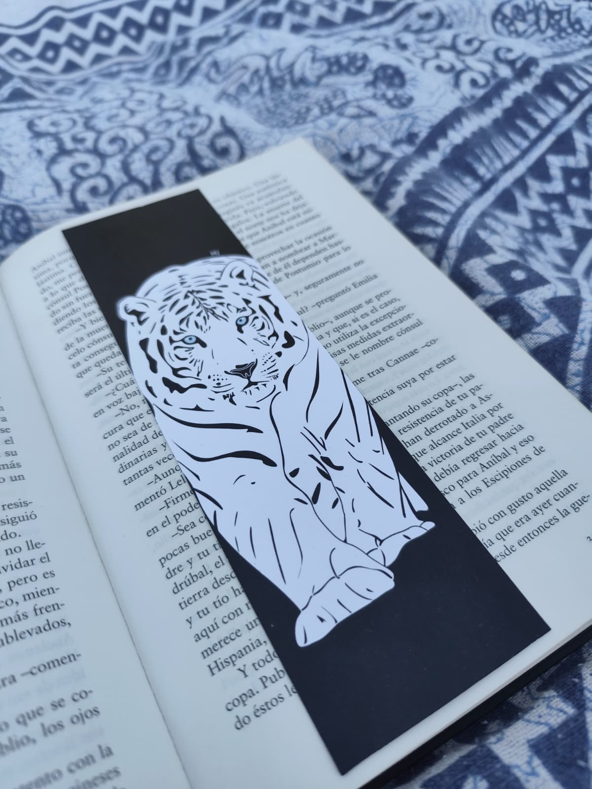 Marcapáginas del Tigre Blanco diseñado con un estilo visual impactante y lleno de contraste. El protagonista aparece en primer plano, con un pelaje trabajado en blancos y negros muy marcados, acompañado de sutiles tonos azules que le dan un aire frío y elegante.