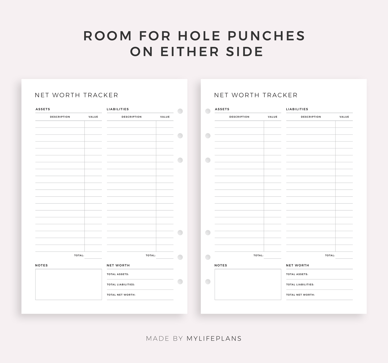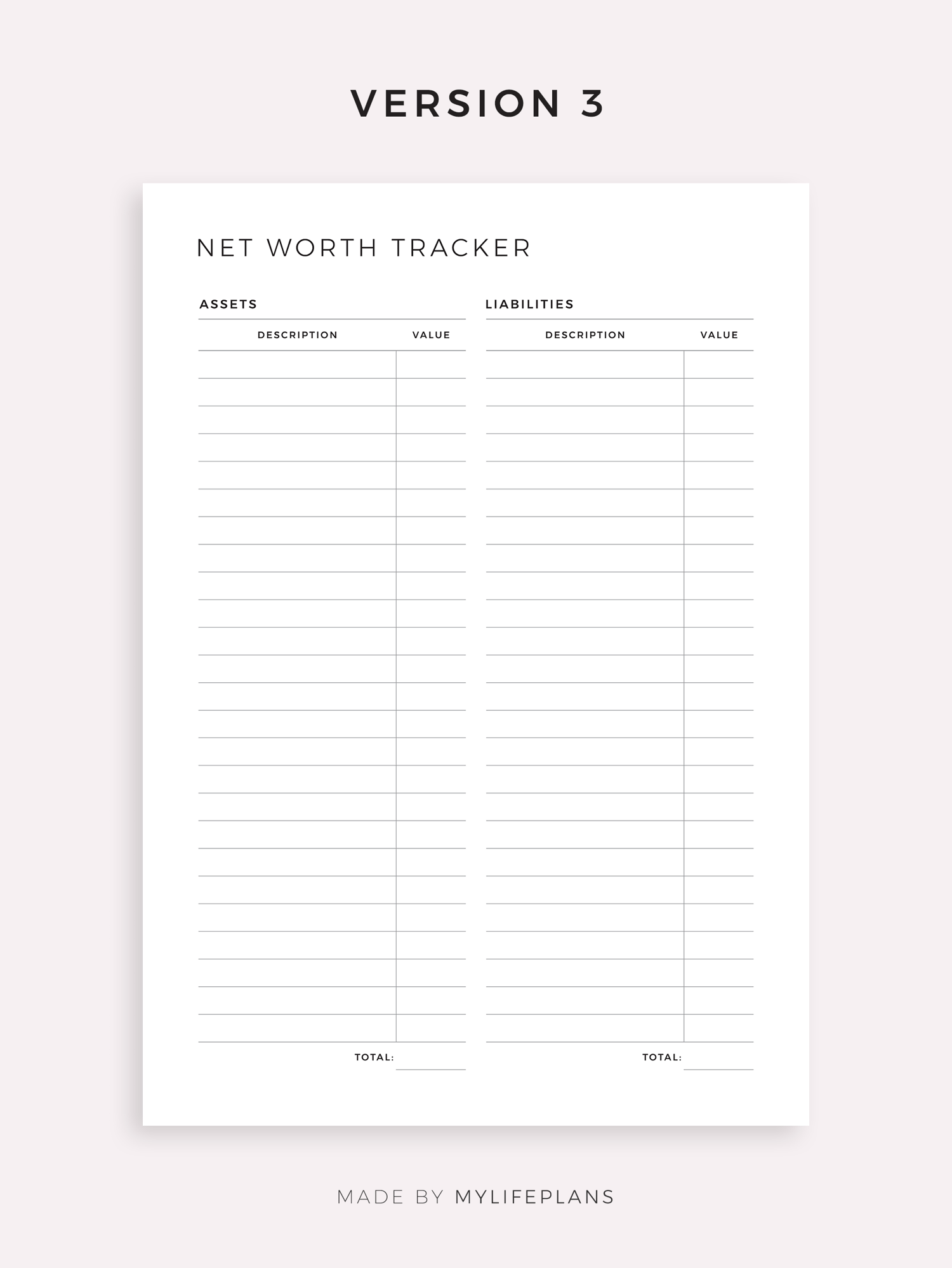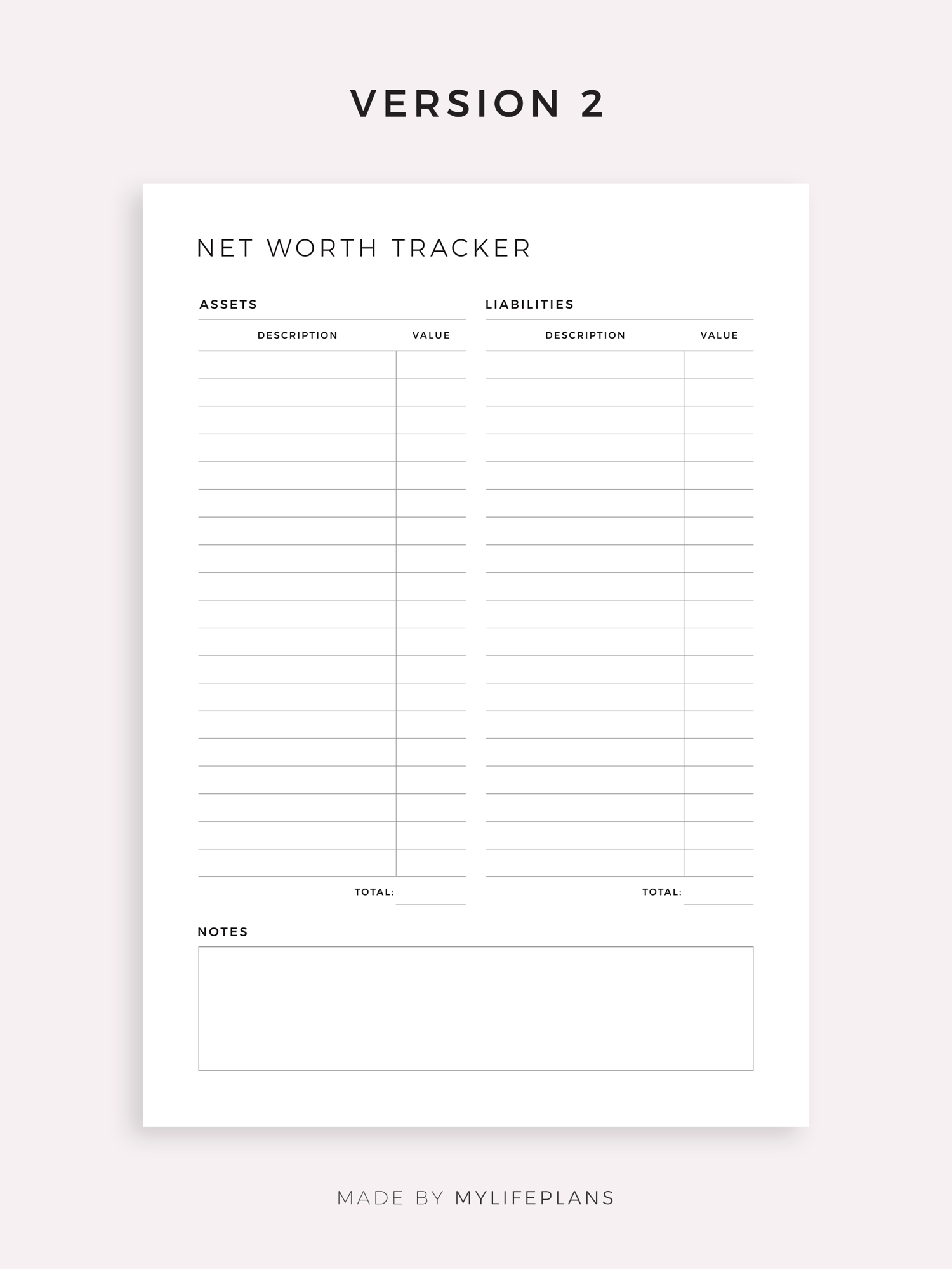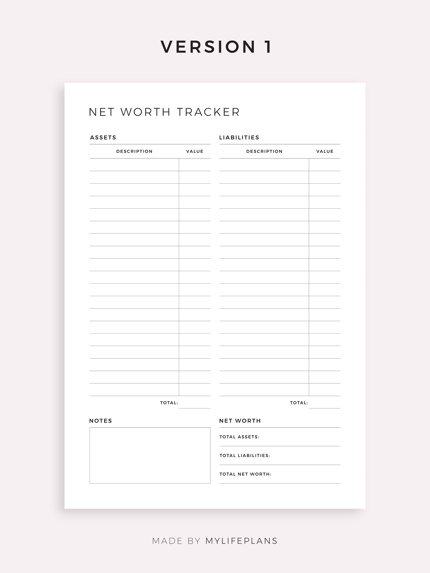 This is a printable net worth tracker template — just download, print, and start using it right away.
