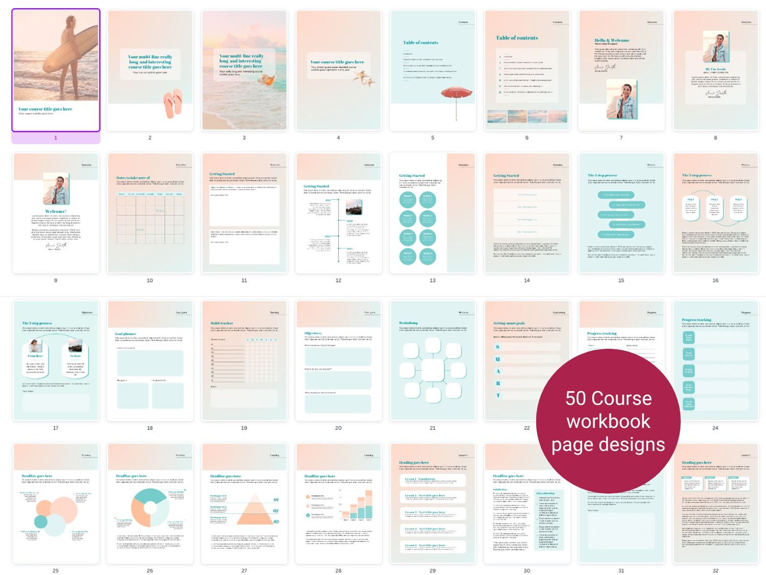 - 50-page Canva Pro Course Workbook template. Includes page designs for workbook covers, contents, module overviews and objectives, goal setting, planning and tracking, assorted lesson page designs and plenty more…
