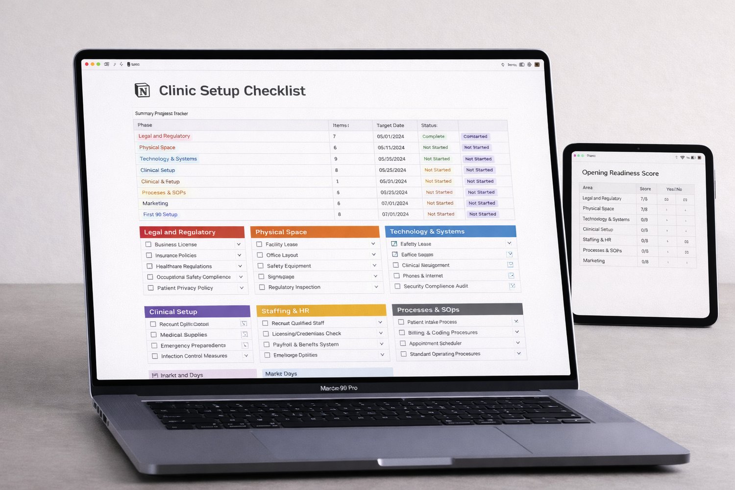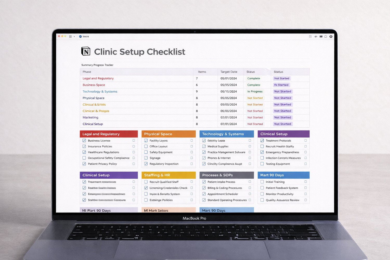 - 🏗️ Phase 2 — Physical Space (12 items): Lease, fit-out, fire safety, signage, clinical areas