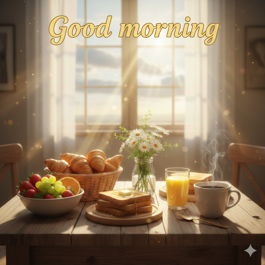 A beautiful good morning breakfast scene filled with warm sunlight streaming through a large kitchen window. A rustic wooden table is elegantly set with freshly baked croissants, golden toast with melting butter, a bowl of fresh fruit (strawberries, grapes, and oranges), a glass of orange juice, and a steaming cup of coffee with soft steam rising. A small vase of fresh flowers sits in the center of the table. Sunlight creates a soft golden glow across the table, giving the scene a peaceful, cozy, and welcoming atmosphere. The background shows light curtains gently flowing and a calm morning sky outside.