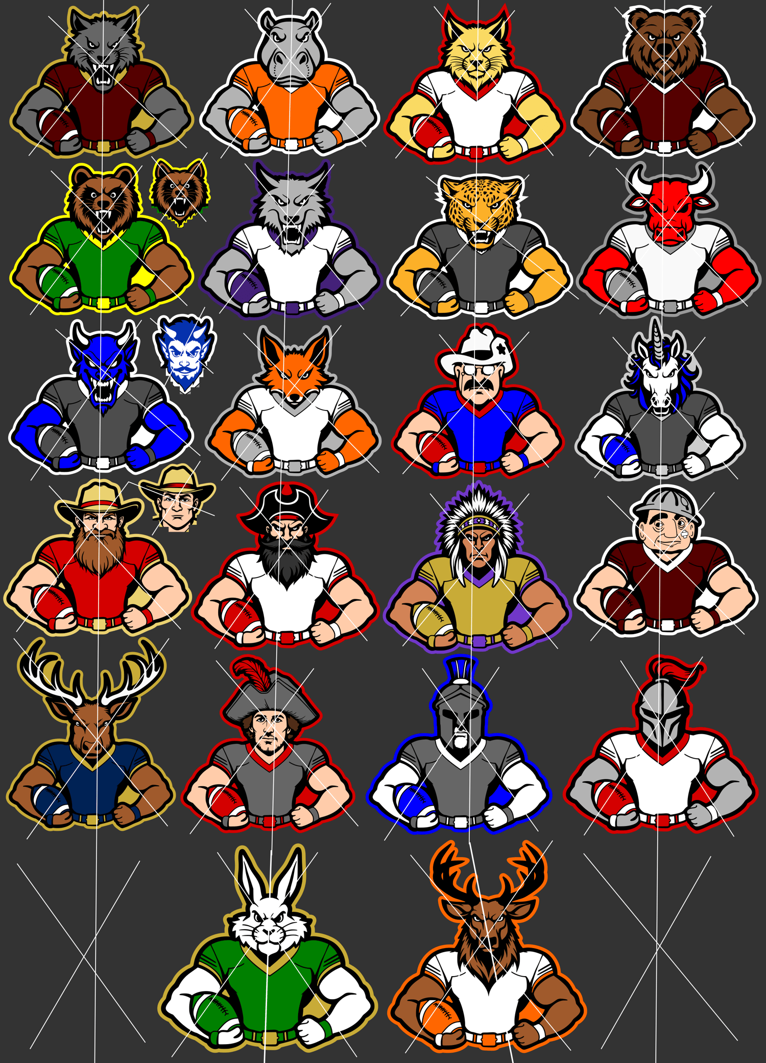Show off your team pride with this Football Mascot SVG Bundle! This ZIP file includes 22 high-quality SVG designs and 3 alternative SVGs designs, perfect for homecoming mums, garters, and school spirit crafts.