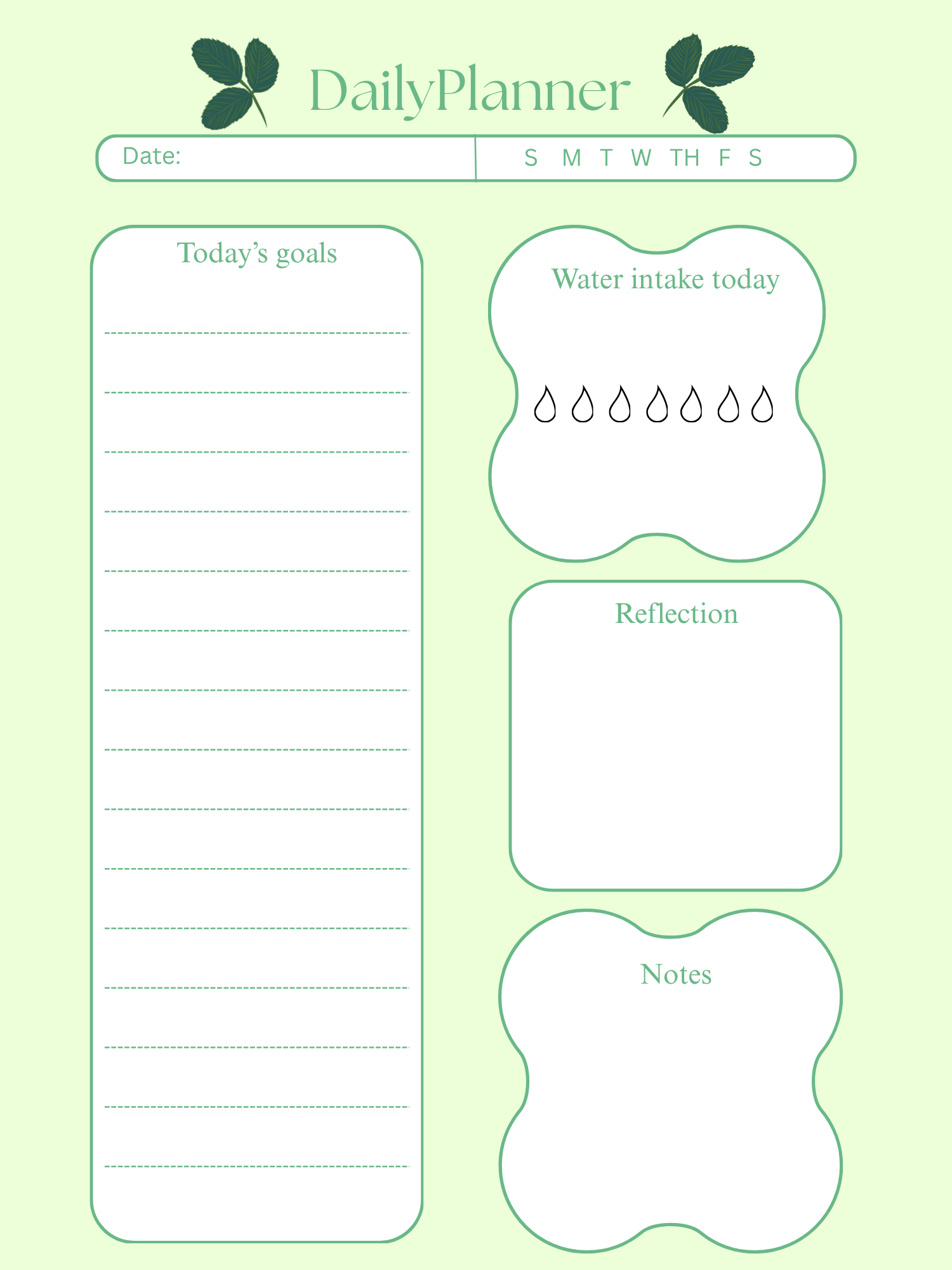 - Includes Today’s Goals, Reflections, Notes, and Water Intake sections