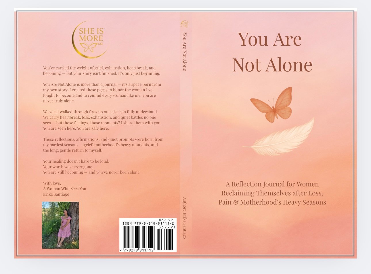 You Are Not Alone was created for the woman who feels unseen in her grief, her exhaustion, or the quiet weight of motherhood. Inside these pages you’ll find guided reflections, gentle prompts, affirmations, and open space to breathe — all designed to help you reclaim your voice, your worth, and your story.