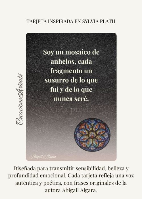 Una colección que respira en los márgenes de la conciencia, donde la palabra se convierte en imagen y la imagen en confesión. Cada tarjeta es un fragmento de sombra, una chispa de lucidez, un eco de Sylvia Plath que se transforma en voz propia.
