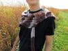 to pull self striping sock yarn into new directions. The loopy I-cord bind off allows you to weave that long tail through the edging to secure the scarf around your neck and shoulders.
