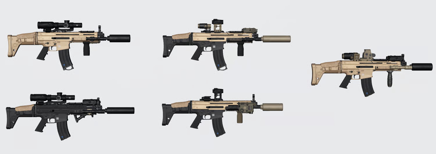 - Variants: CQB (short barrel), standard barrel, and designated-marksman style long-barrel options