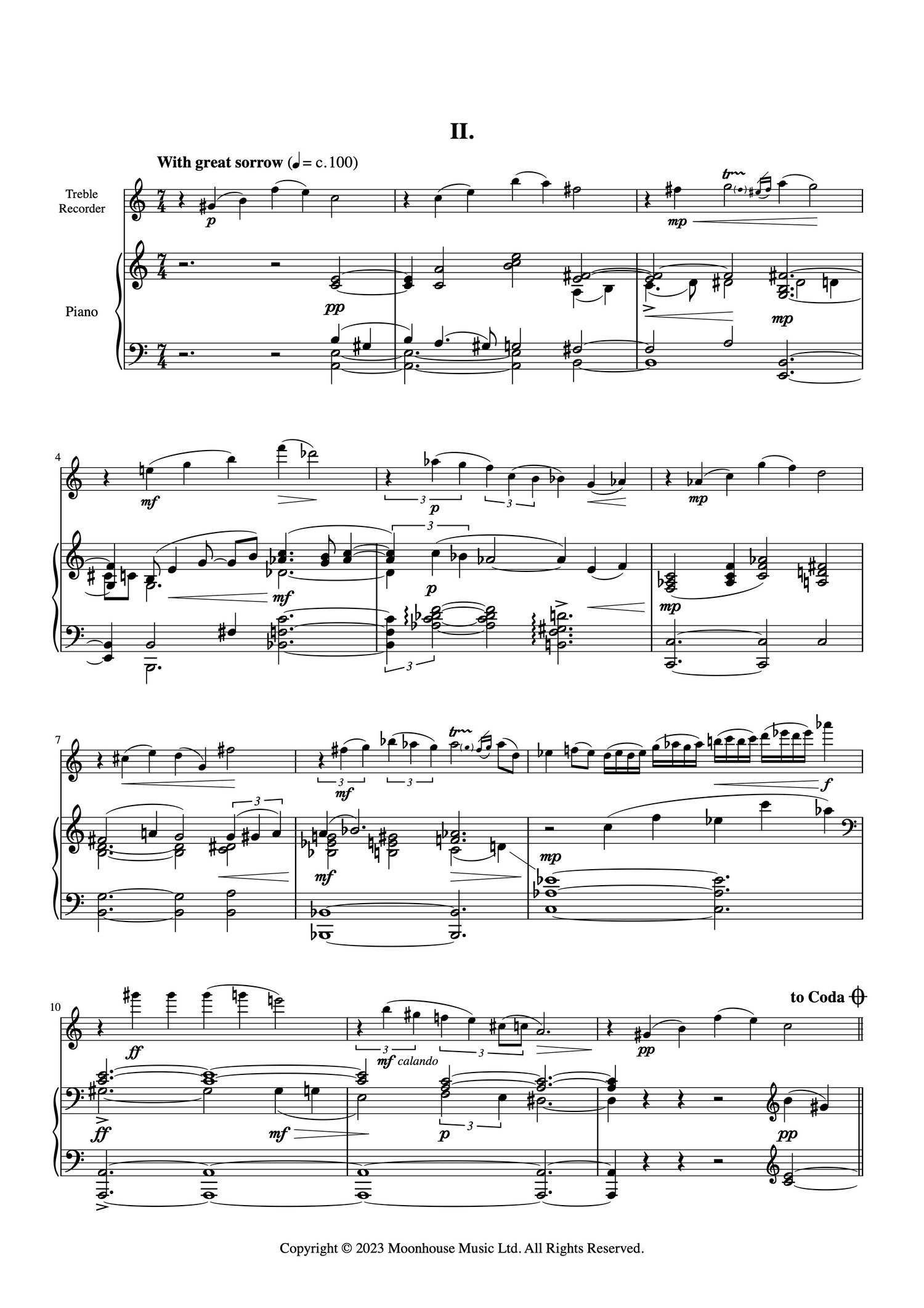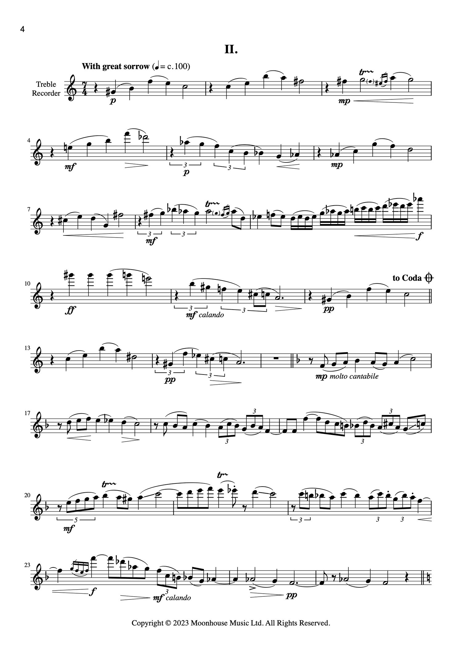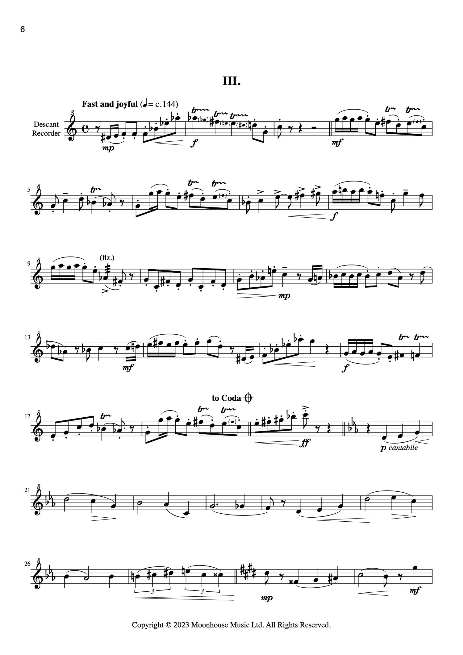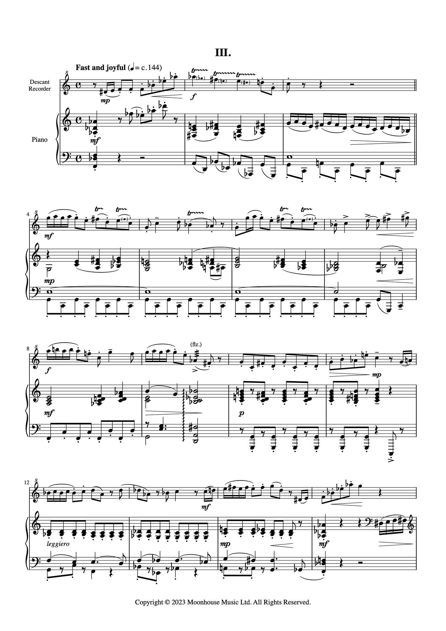 Published in 2023 by Moonhouse Music, this delightful new recorder sonata by Dominic Irving (UK) is a real treat and a refreshing addition to recorder repertoire worldwide. The first two movements are performed on treble recorder (with piano accompaniment) and in the final movement the descant recorder takes centre stage. This exciting new Sonata is guaranteed to delight audiences and is therefore a great addition to any concert programme. Regarding difficulty level, the estimated grade is grade 7/8/+