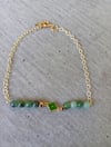 Bracelet en chaîne dorée, orné de perles d’émeraude facettées de 4 mm et d’un petit trèfle central. Une création raffinée, symbole de renouveau, de chance et d’ouverture du cœur, à porter comme un talisman discret.