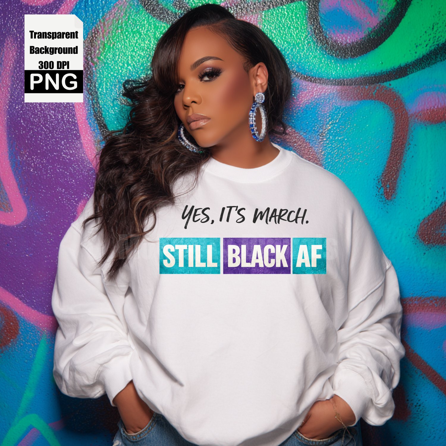 This “Yes, It’s March. Still Black AF” PNG design is perfect for celebrating Black culture beyond Black History Month. Featuring strong statement typography in multiple color variations, this design is ideal for creating standout apparel and accessories.