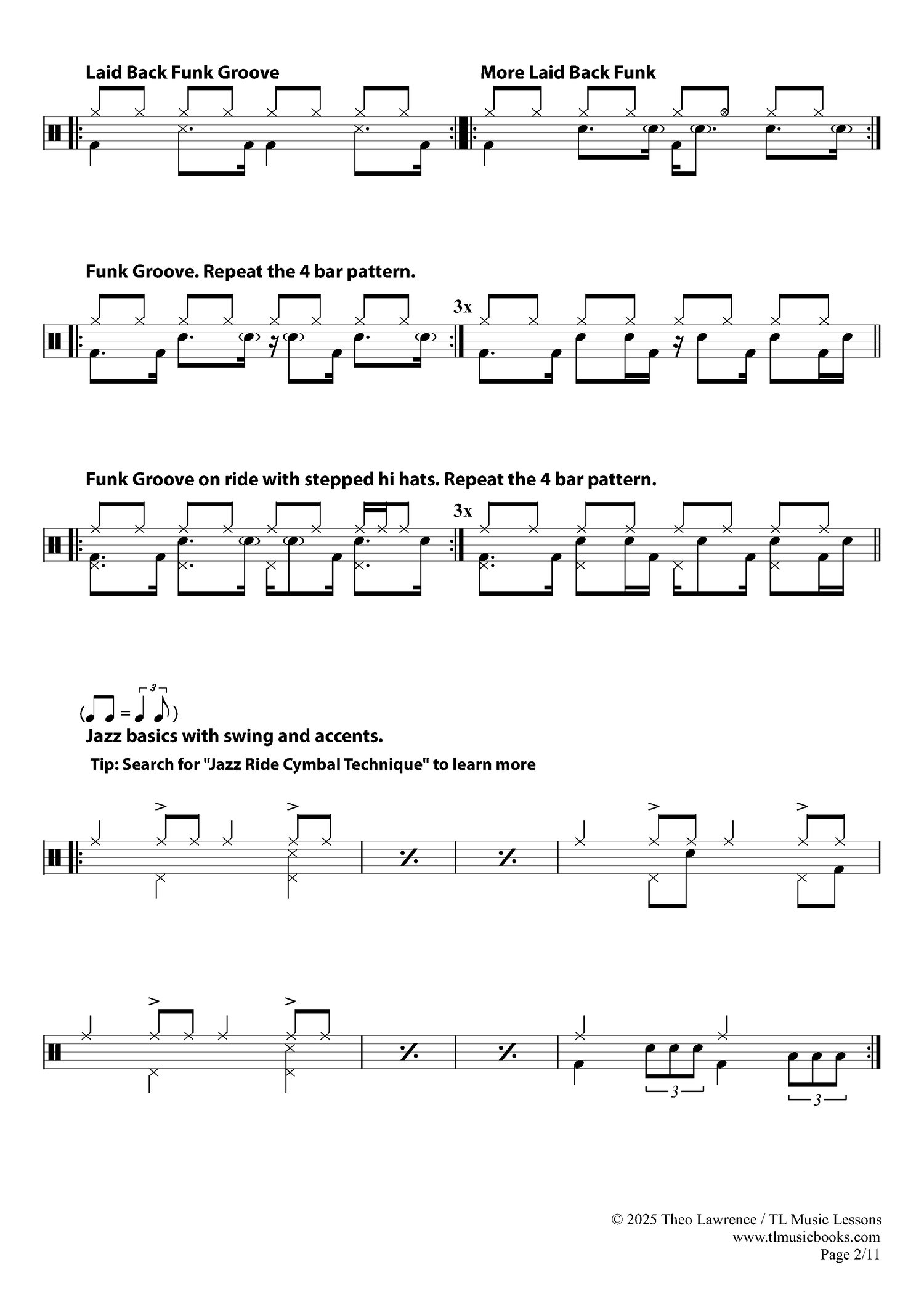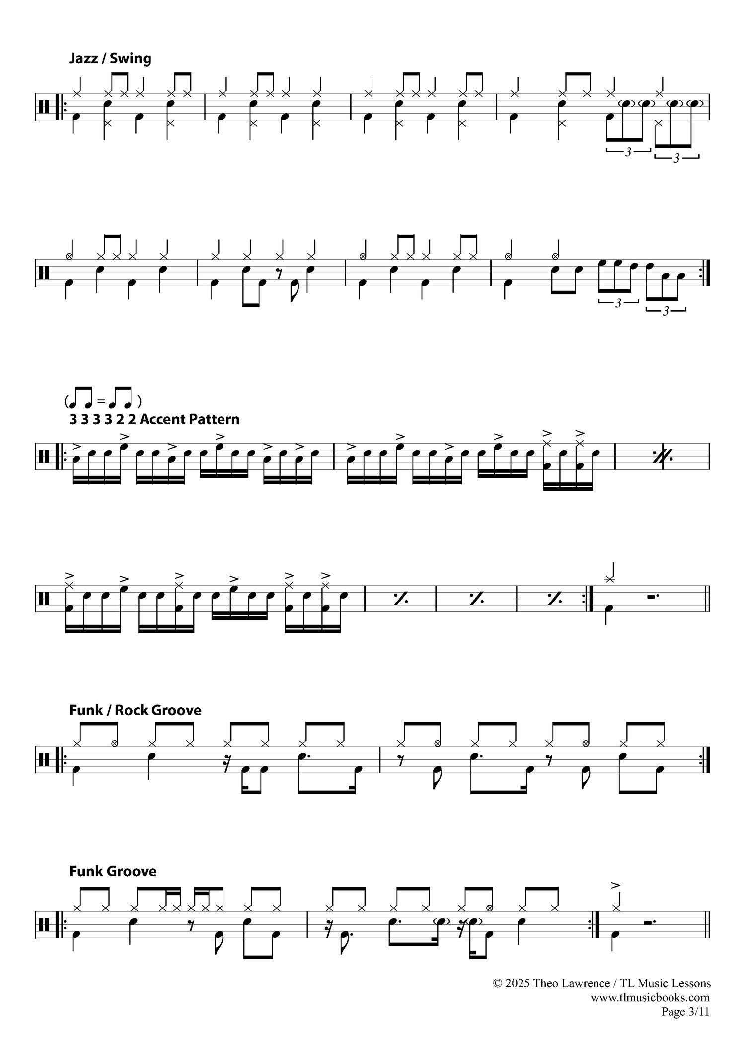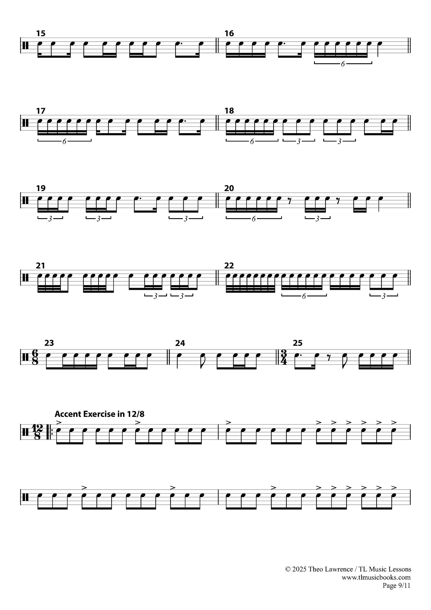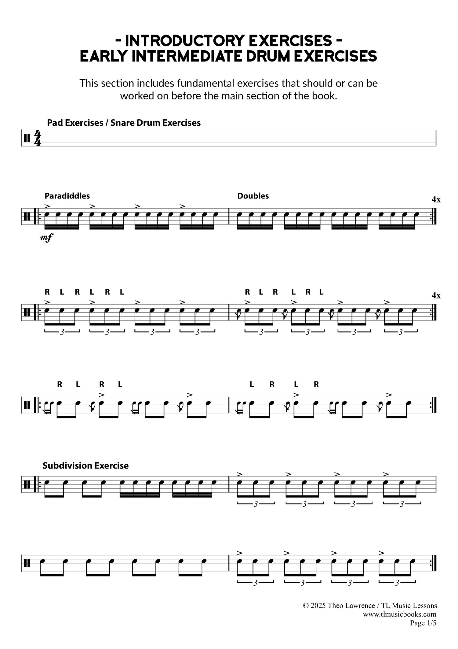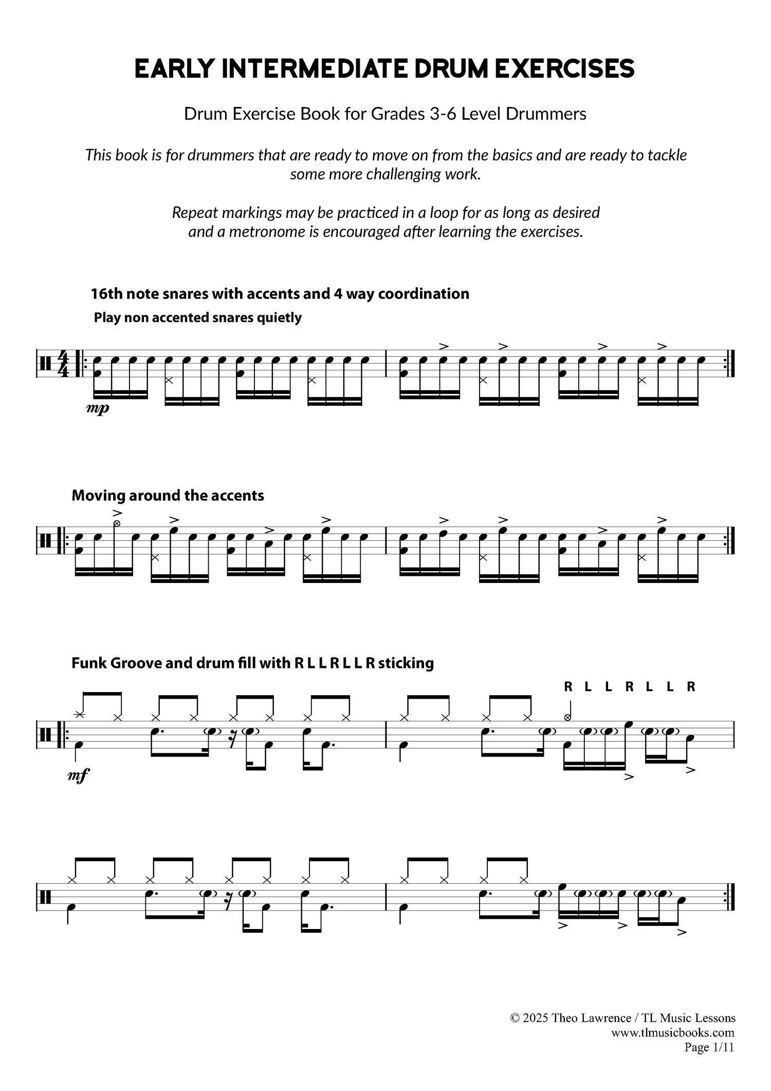 - 16 pages of drum exercises (5 pages of introductory exercises and 11 pages of Early Intermediate Exercises)