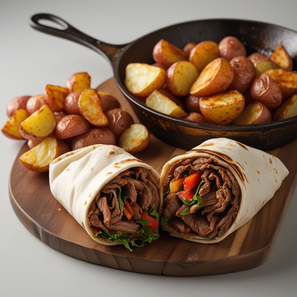 A crispy, golden-brown shawarma wrap, sliced in half, rests on a wooden board alongside a generous serving of fried potatoes, cooked to a golden crisp in a rustic, cast-iron cookware, with a subtle sheen of oil, set against a clean, neutral background, with the shawarma's juicy meat and crunchy vegetables spilling out, invitingly lit to accentuate the textures and warmth of the dish, evoking the aroma of a bustling street food market.