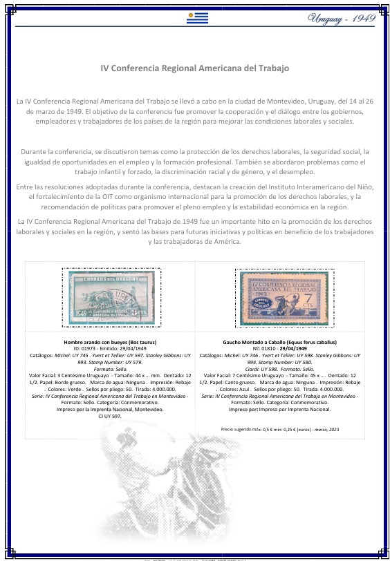 Esta ficha en formato PDF corresponde a los sellos emitidos por Uruguay en 1949 dedicados a la IV Conferencia Regional Americana del Trabajo.