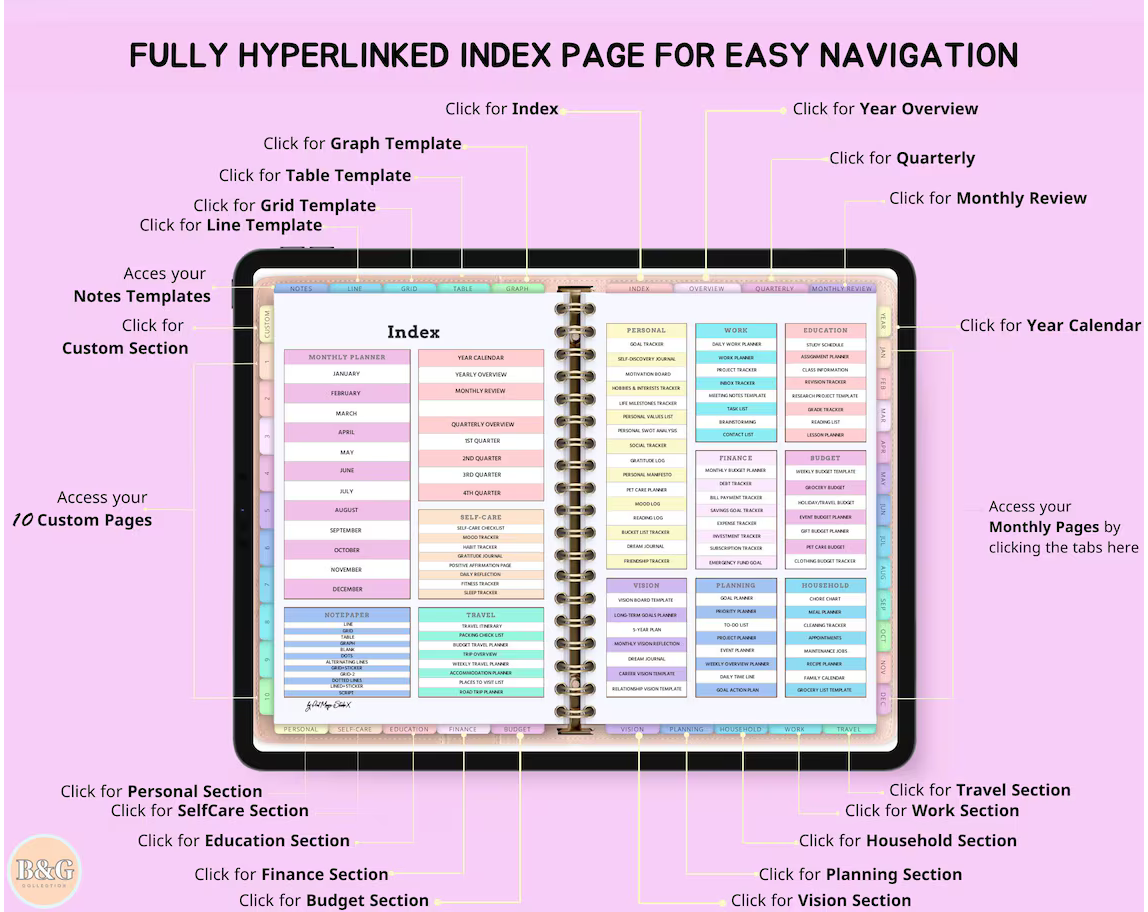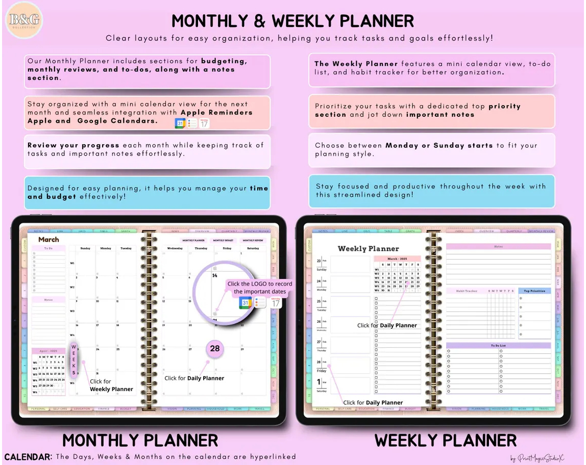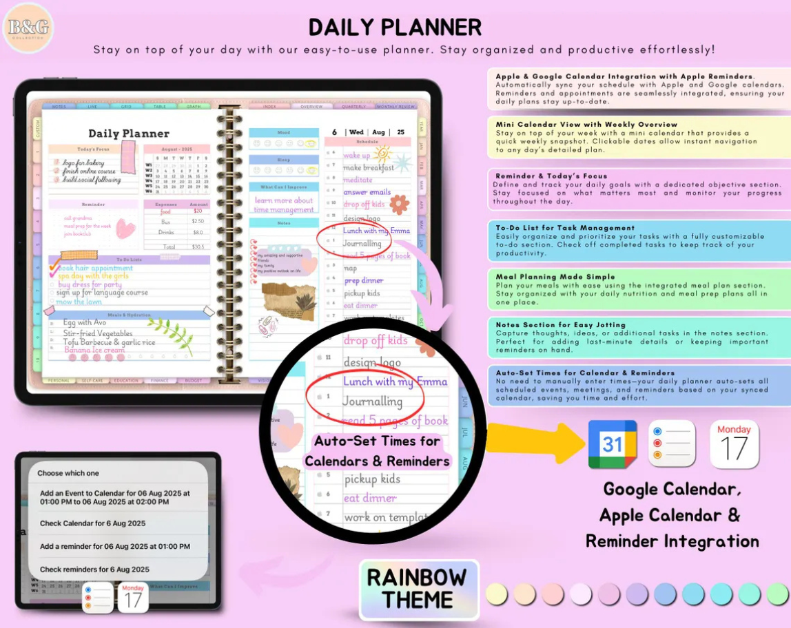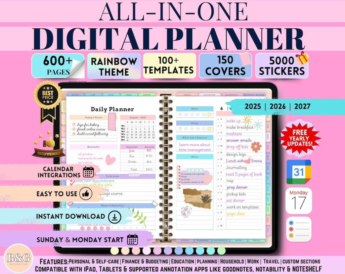 ⭐️Take your productivity, creativity, and organization to the next level with the ultimate All-In-One Digital Planner. This vibrant, rainbow-themed planner features 86 templates across every aspect of your life, from personal development to education, budgeting, and travel. Fully customizable with 5000 stickers and 150 unique covers, this digital planner is compatible with both Apple and Google devices, offering seamless integration across all your tech. Plus, enjoy free yearly updates that ensure your planner stays up to date with the latest features!