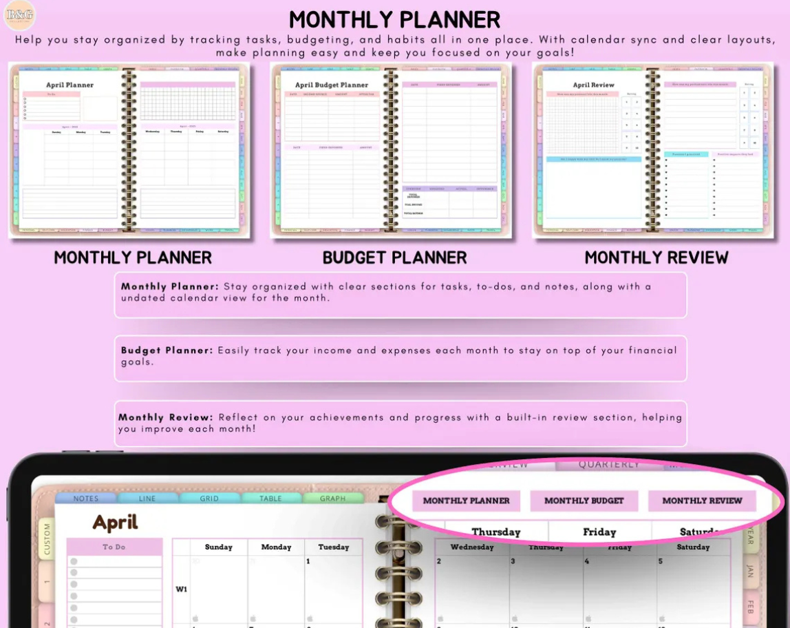 - Monthly Budget Planner: Manage your finances month by month.