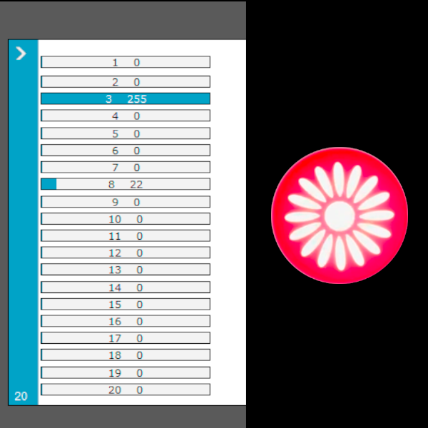 * Verifique que con el canal 3 al máximo y el canal 8 en el valor 22, muestre el Gobo de la cuarta foto.