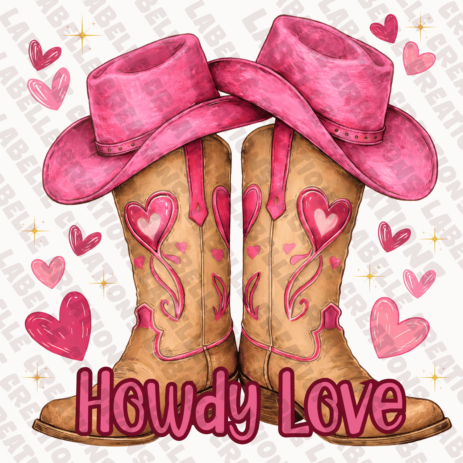 This fun and stylish digital illustration features a pair of rustic cowgirl boots topped with bright pink cowboy hats, decorated with heart details and surrounded by floating hearts and sparkles. The bold phrase “Howdy Love” at the bottom adds a playful western charm, blending country vibes with Valentine sweetness. The color palette of warm browns, vibrant pinks, and soft romantic accents creates a cozy, trendy aesthetic perfect for seasonal designs.