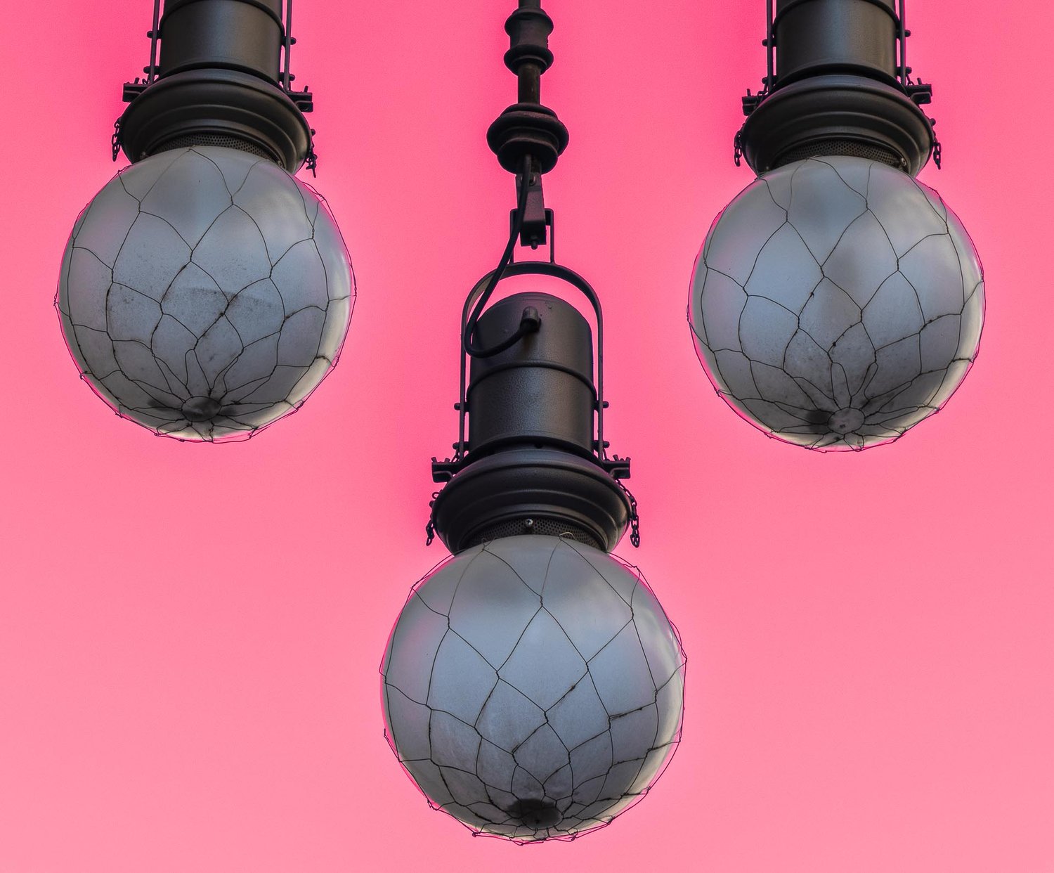 Three vintage-style lanterns with cracked glass designs are placed against a hot pink background. The bold contrast between the dark metallic tones of the lanterns and the bright pink creates a striking visual composition.