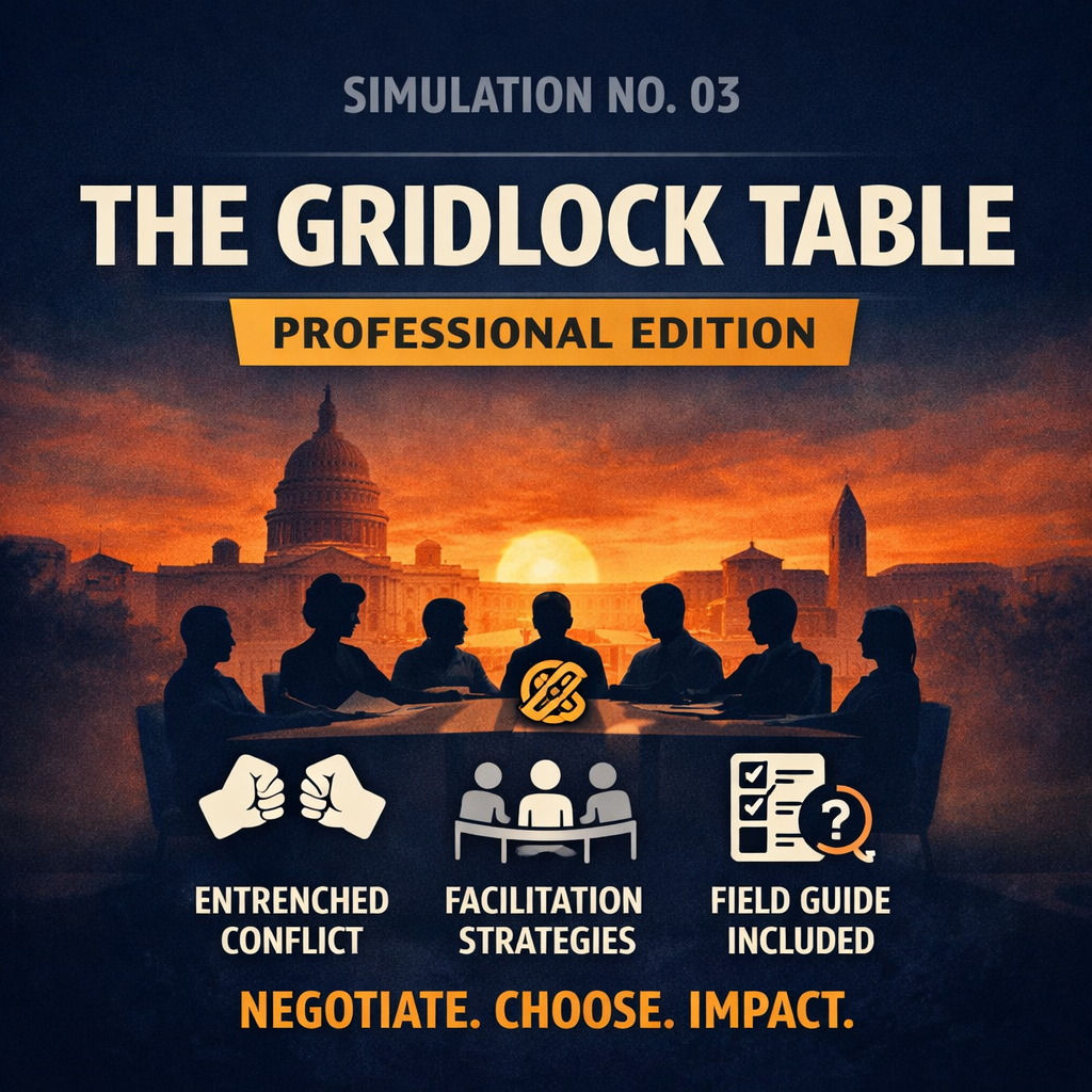 Simulation 03 — The Gridlock Table (Professional Edition) is a high-fidelity leadership simulation designed to replicate decision paralysis in complex organizations. Participants operate within a system of fragmented authority, misaligned incentives, incomplete information, and enforced decision thresholds—revealing how structural conditions, not individual behavior, create gridlock.