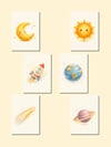 → 6 illustrations: Moon (with face), Sun (with face), Saturn, Rocket, Comet, Earth