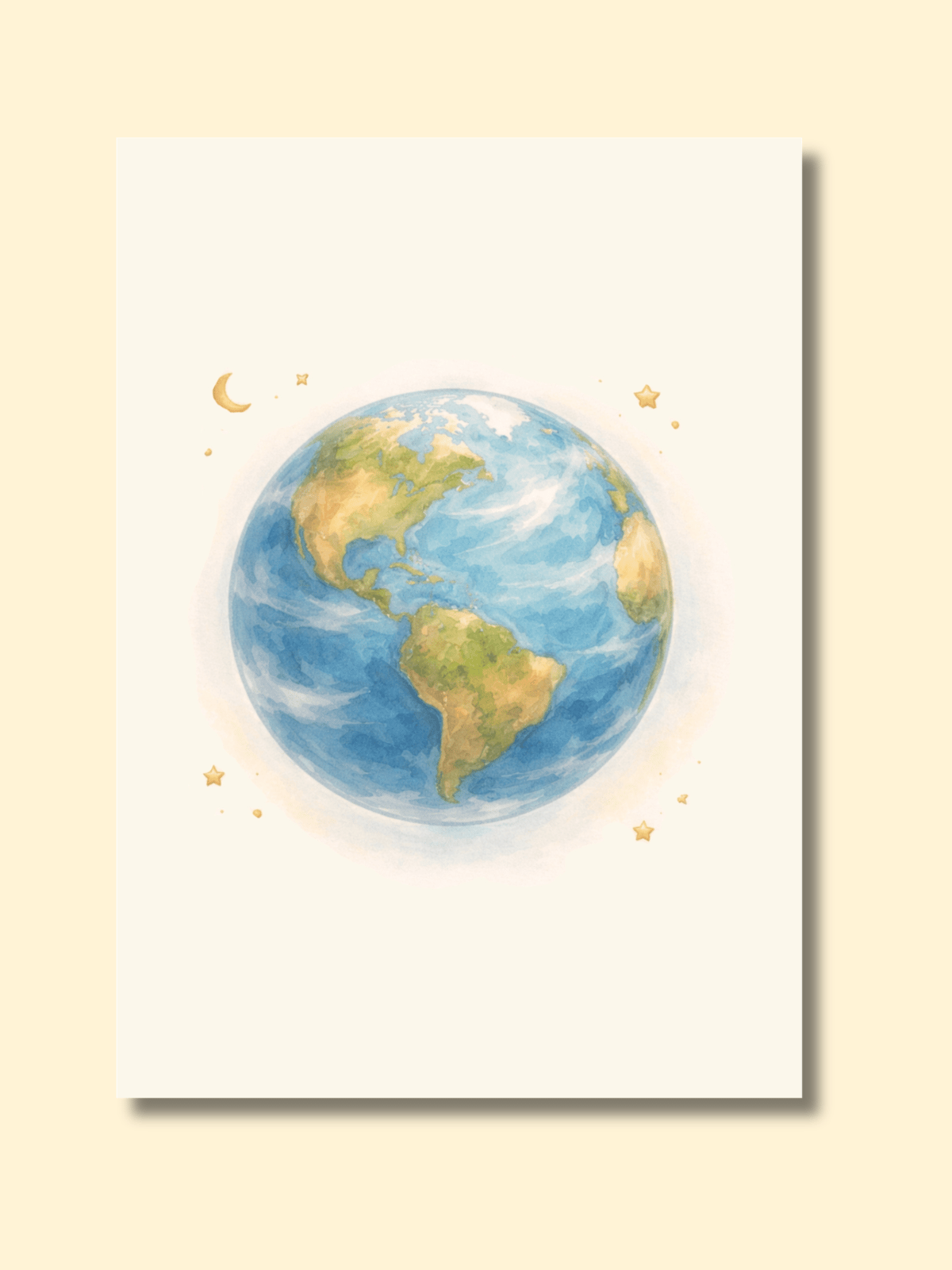 The solar system in soft watercolor — a friendly moon with a gentle face, a warm glowing sun, Saturn with its rings, and a classic red-and-white rocket. Dreamy, celestial, and full of wonder.