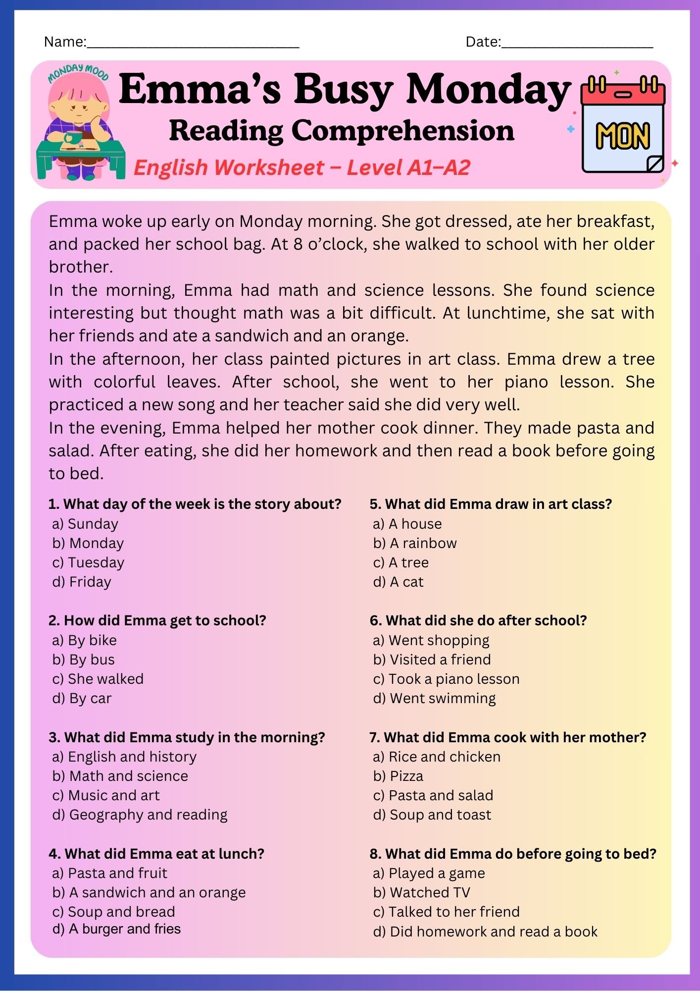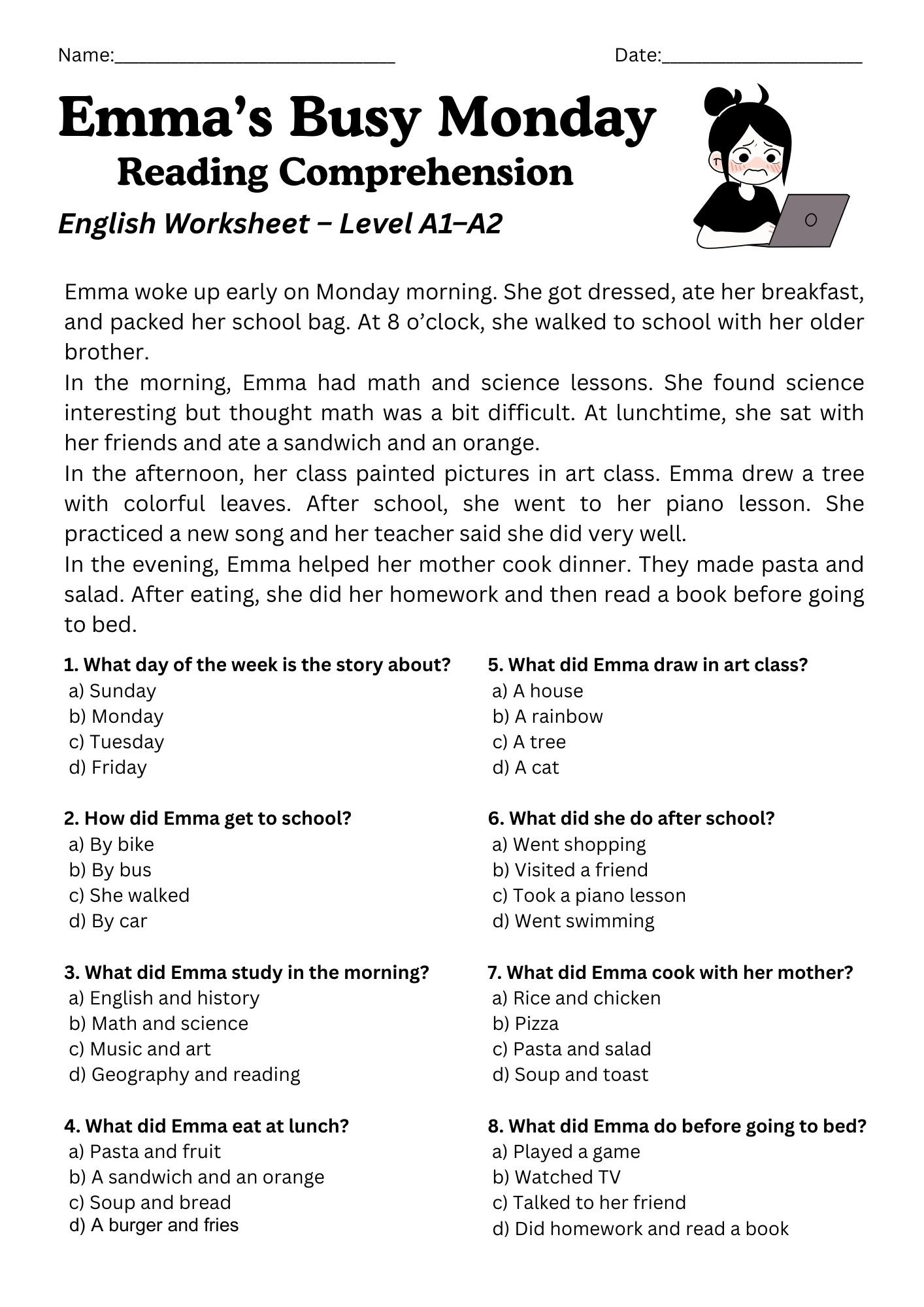 Reading Comprehension – Emma’s Busy Monday (A1–A2 Level) ✔ Color & B&W Versions + 8 Multiple-Choice Questions