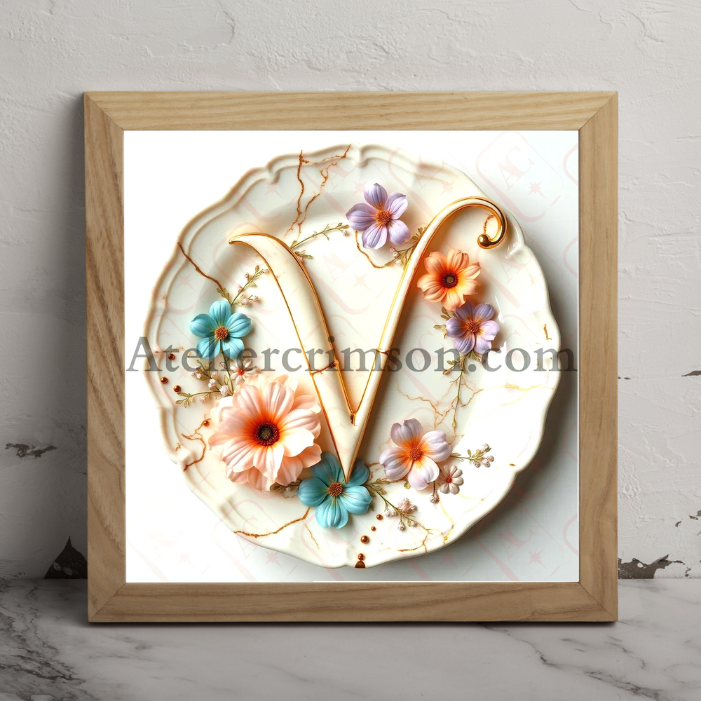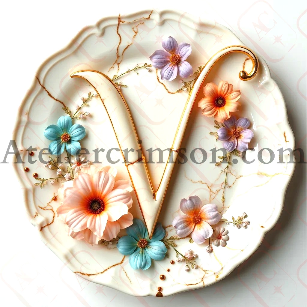 The letter V flowers and procelaine .Download Now this high quality AI-generated image, perfect for adding a touch of tranquility and creativity to any space.