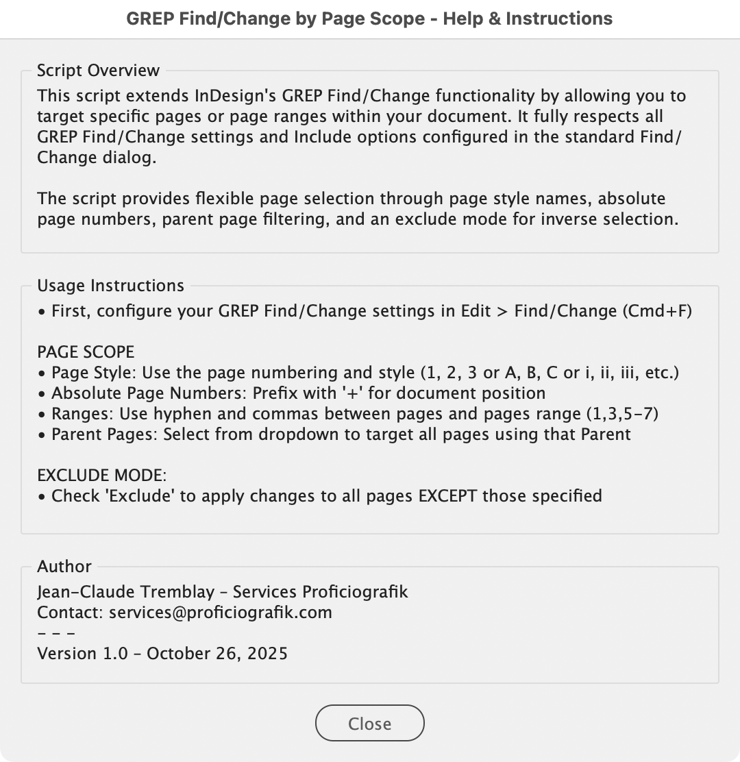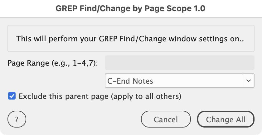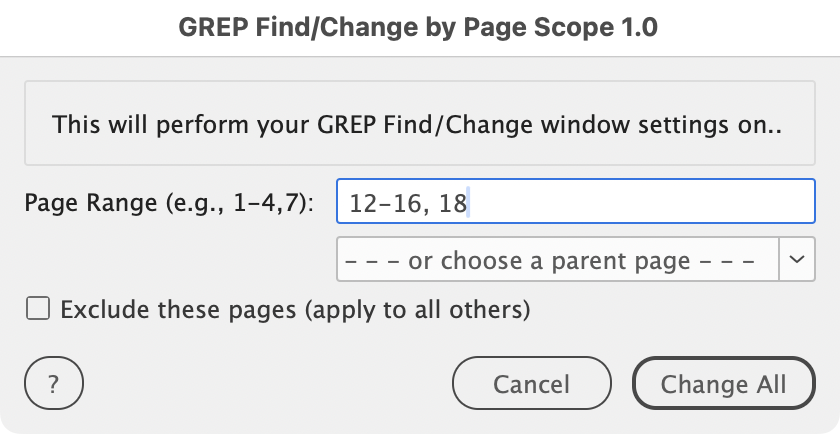 This InDesign script brings page-level precision to GREP Find/Change operations. While InDesign's native GREP works across entire documents, this tool lets you target specific pages, page ranges, or by parent pages. Simply configure your GREP patterns in the standard Find/Change dialog, then specify exactly where those changes should apply.