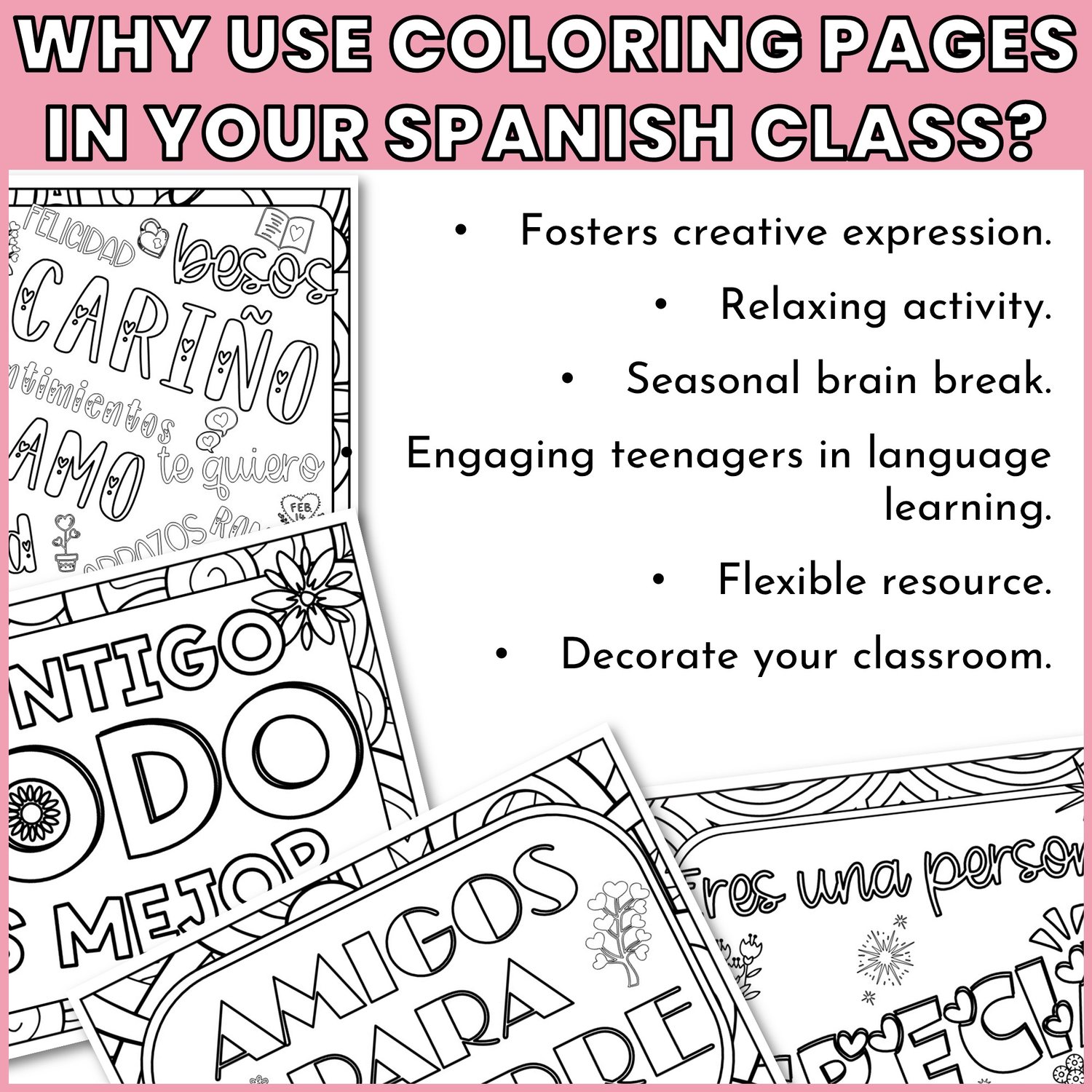 This set of high-quality hojas para colorear de San Valentín is a wonderful, zero-prep resource that keeps your students focused while celebrating themes of friendship and love in Spanish. They are specifically designed for middle school and lower levels of high school students who still love to get creative!