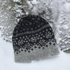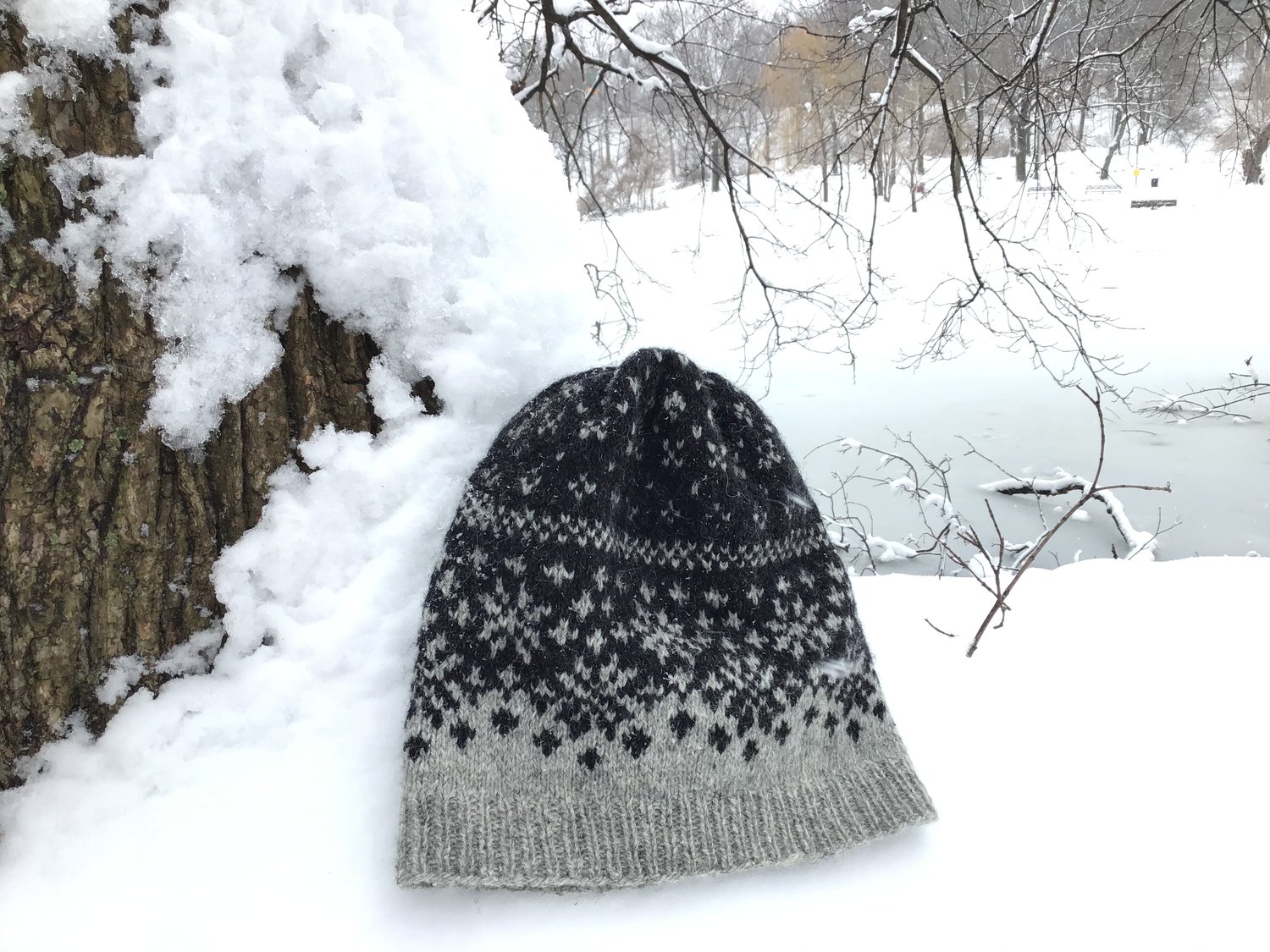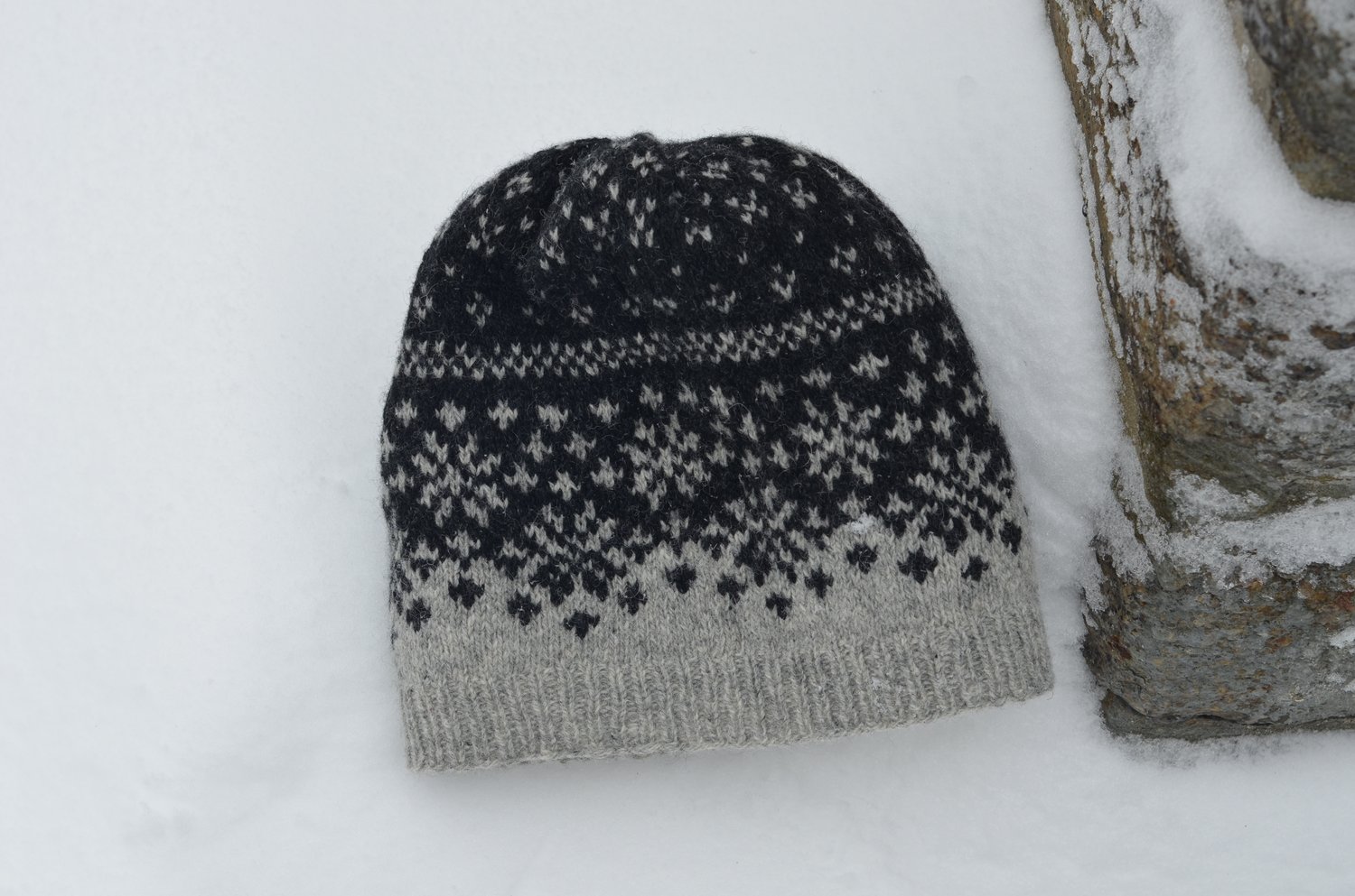 Hat A is shown in size Medium with Taller Crown Shaping made with 1 skein each of Harrisville Designs Shetland (100% wool, 217 yards/50 grams) in colors Ebony (MC) and Silver Mist (CC).